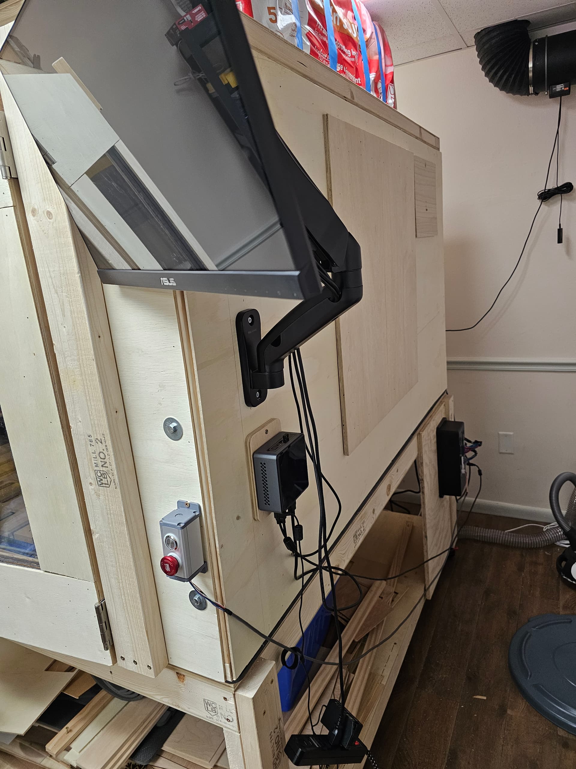 The Warthog electronics are attached to a piece of scrap plywood that is bolted to the back right table leg. I added a monitor arm to the side near the front for a touch screen monitor and below that an old Intel NUC PC for controlling the thing. The USB cord from the Warthog runs over to that.