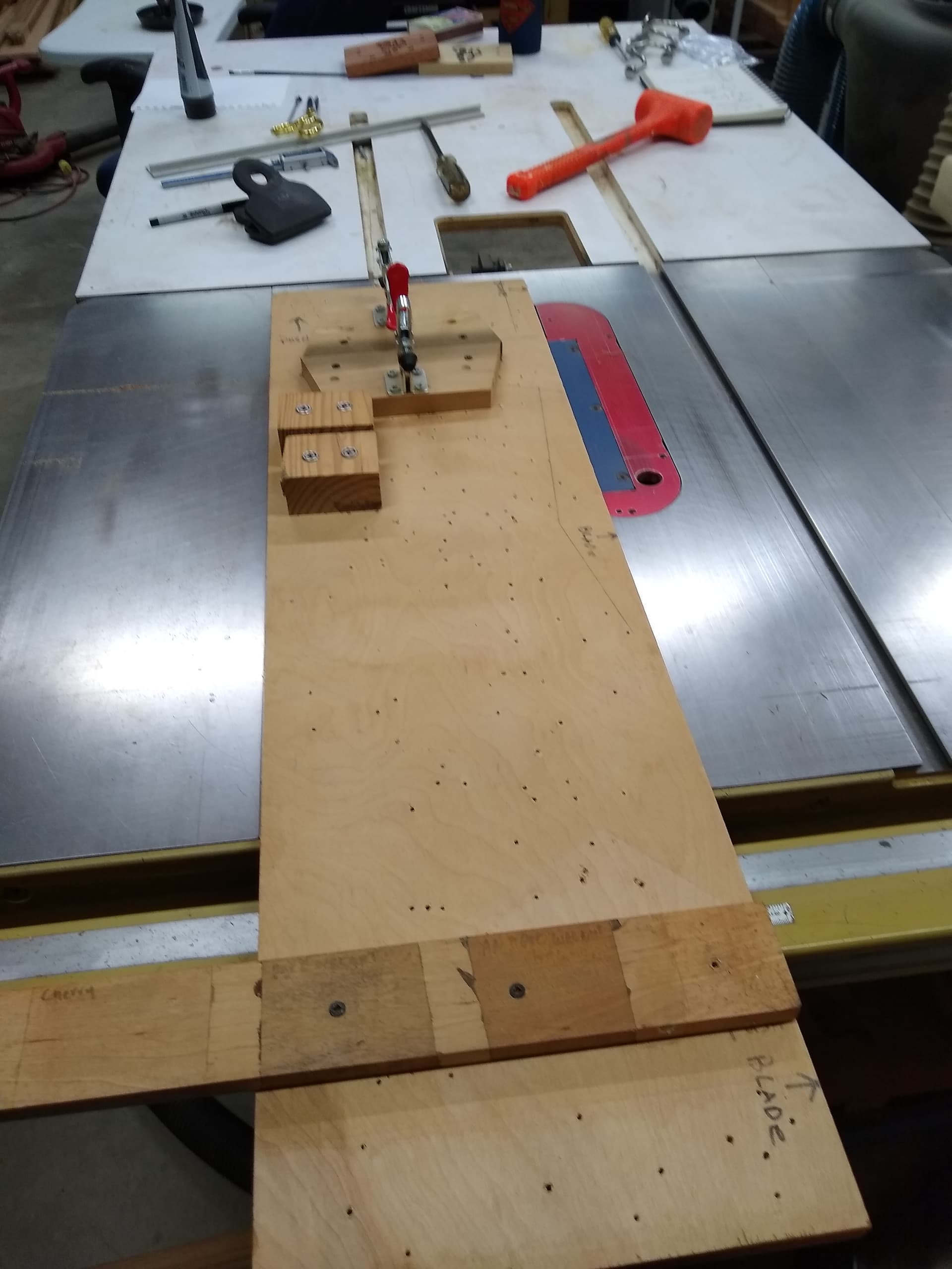 I have a shooting board that I use to make straight edges on rough lumber. I have a bunch of the Microjig dovetail clamps. I am going to make a new shooting board utilizing the clamps to replace my well worn one. The bottom of the current one just has a t track used in the miter slot to guide it. I will just move it over to the new one.