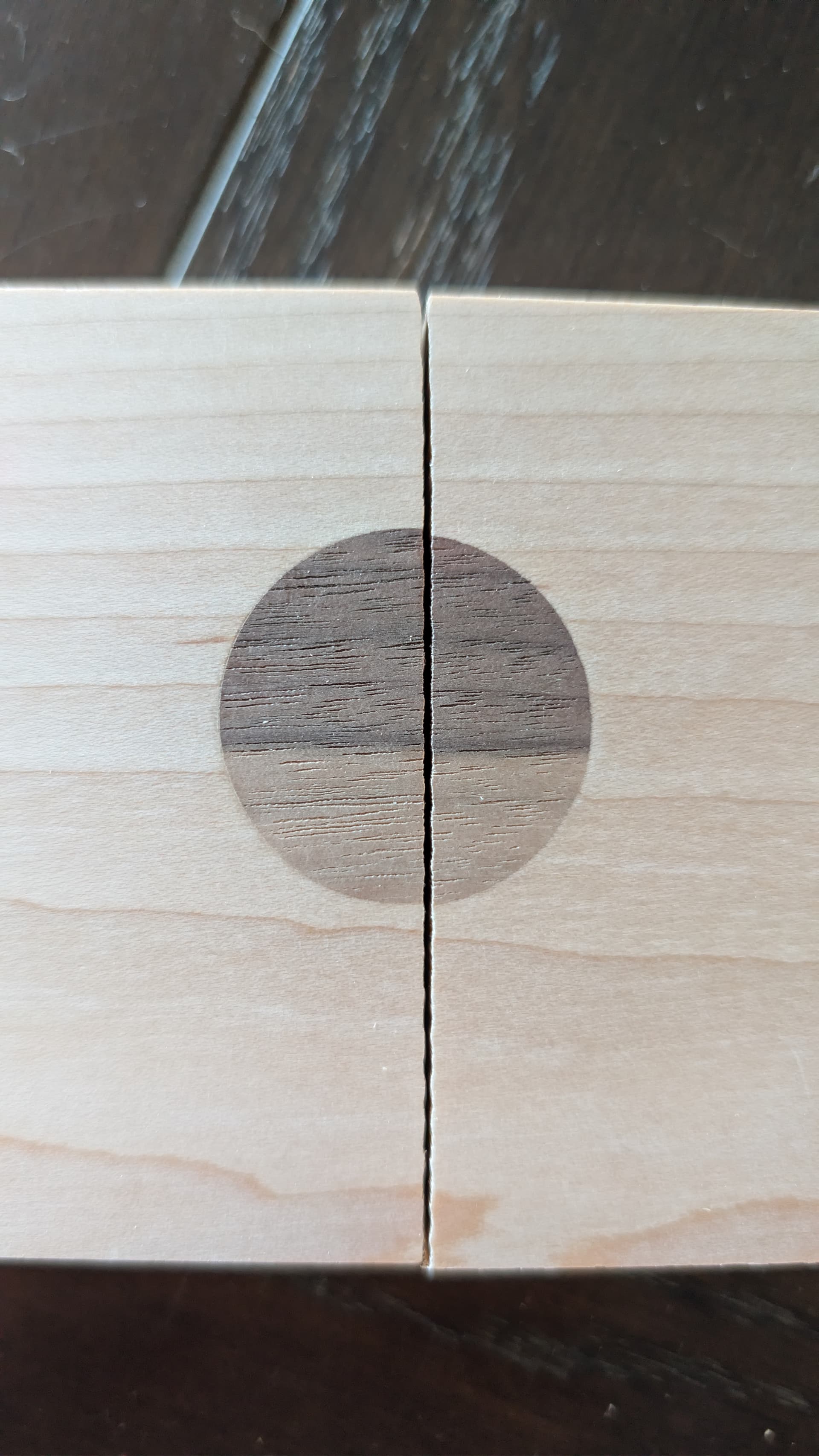 It was kind of hard to measure since the round plug was wobbling around on top of the pocket, so that 2.5mm might have been off. I’m going to cut a pocket and inlay using that offset. I’ll glue it up and then cut it in half to see what it truly is. I’ll report back tomorrow afternoon.