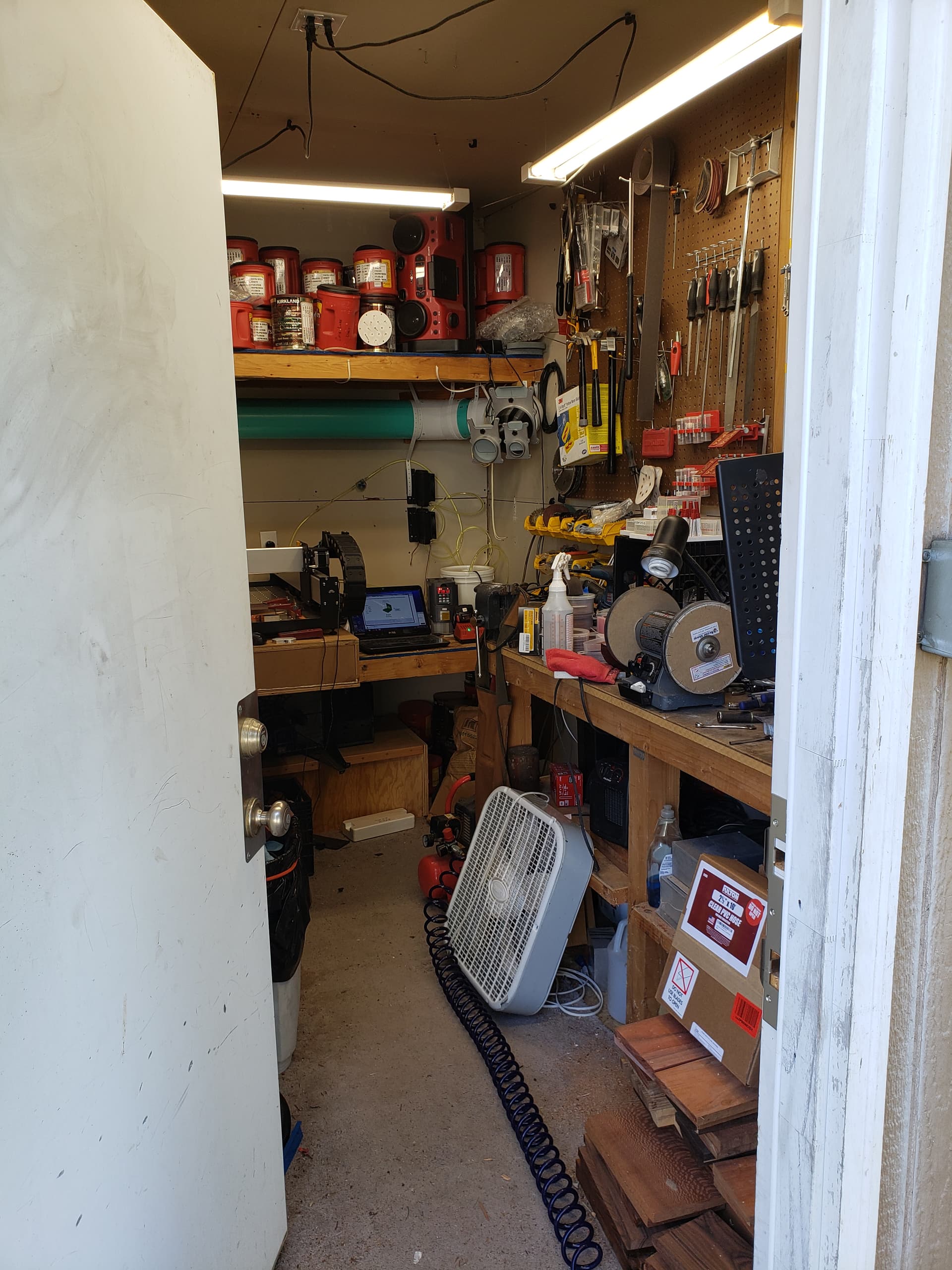 I also divided the space inside inside in half with a wall and a large sliding barn door with window so people didn’t sneak up on me. One side was the shop. The other side was storage for wood and other things as well as home for the noisy stuff like the air compressor and the dust extractor. I didn’t AC that side.
