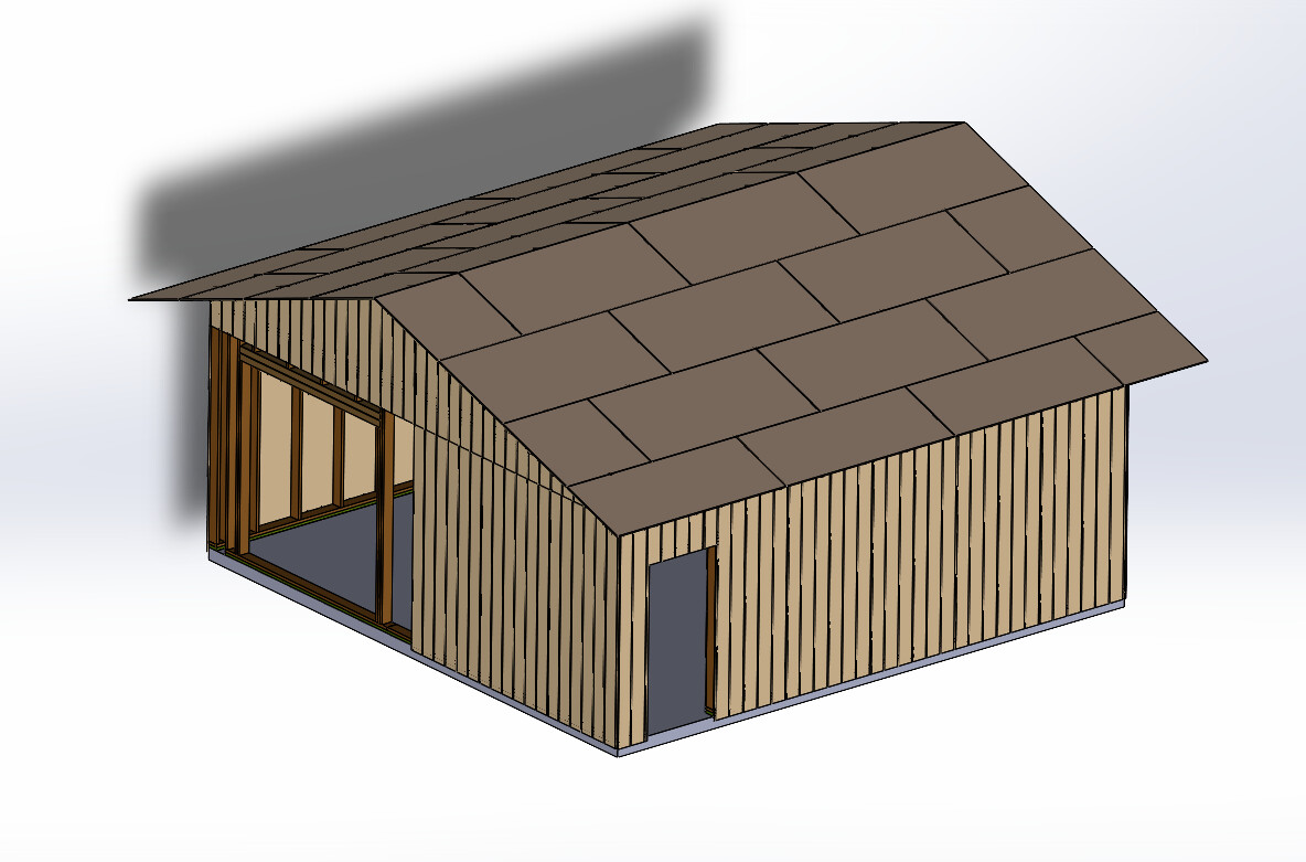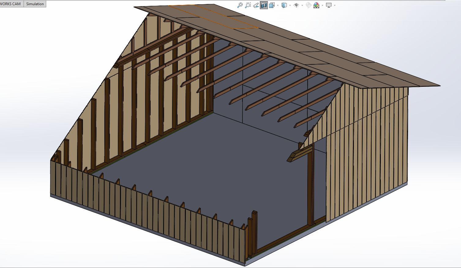 Still working on the design, but here is a couple of views of what I have so far. I originally was going to just kind of rough it up to get an idea of materials and cost, but I just keep on working on it here and there while I procrastinate drilling holes in my slab for the mud sill anchor bolts. The trusses are just there, but not designed since I just needed the angle and lengths right for now to get the shape for the roofing material. A truss company is going to design and make them using the codes appropriate for my area.