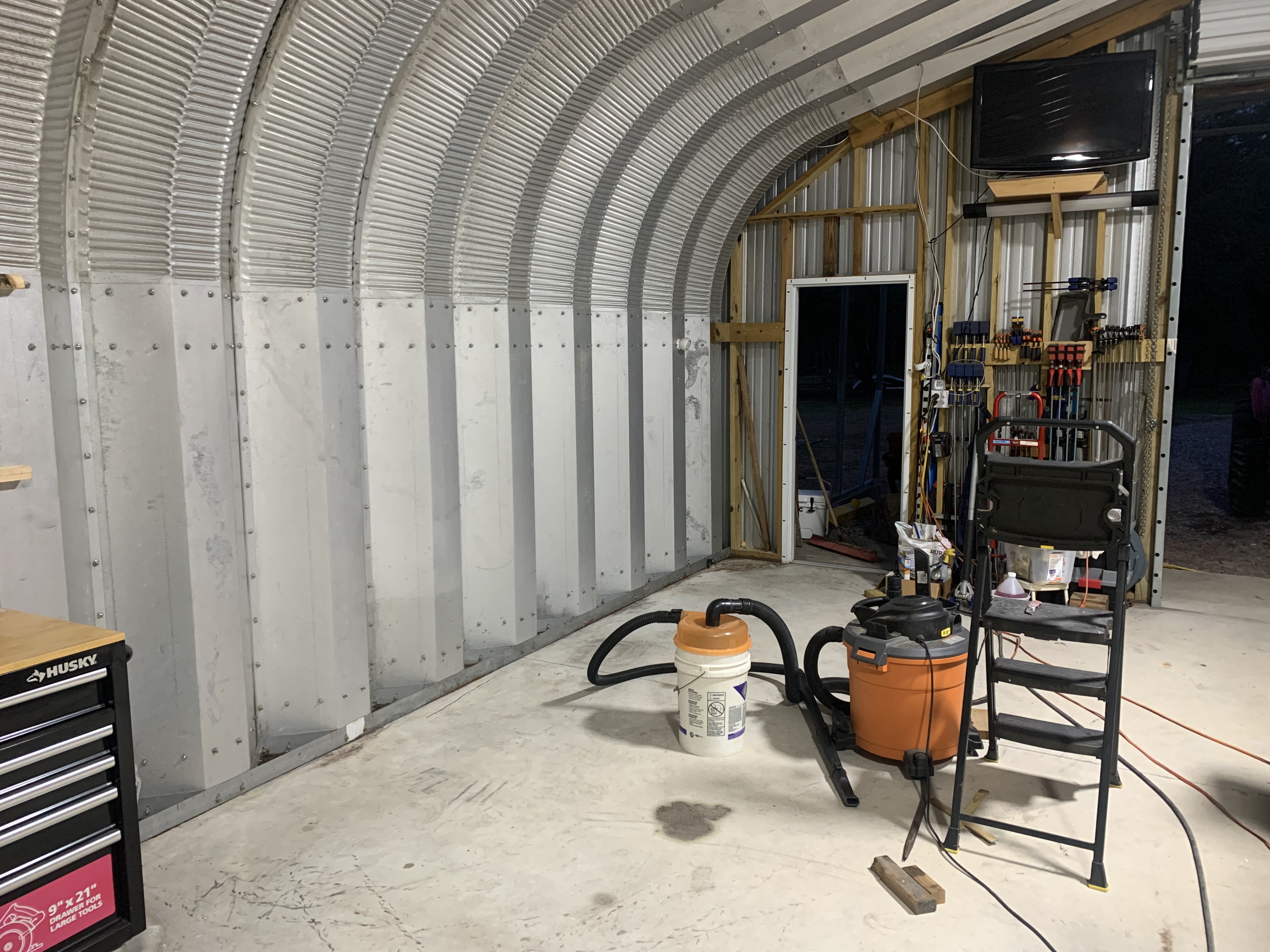 I picked up this 30x36x14’ off of Craigslist, it was new on a pallet and could not be used as intended when purchased. It did not have the end panels. I had to make them my self, Used 6”x6” PT posts to build out the doorway framing for a 10x10 rollup and 2x6’s for the rest of the wall frame. TrexDeck 1x6” was used to set the wall frame on and then anchors thru them into the slab. This kept any wood off the slab even though it was all PT lumber. Just used standard 36” wide roofing tin for the sheathing,