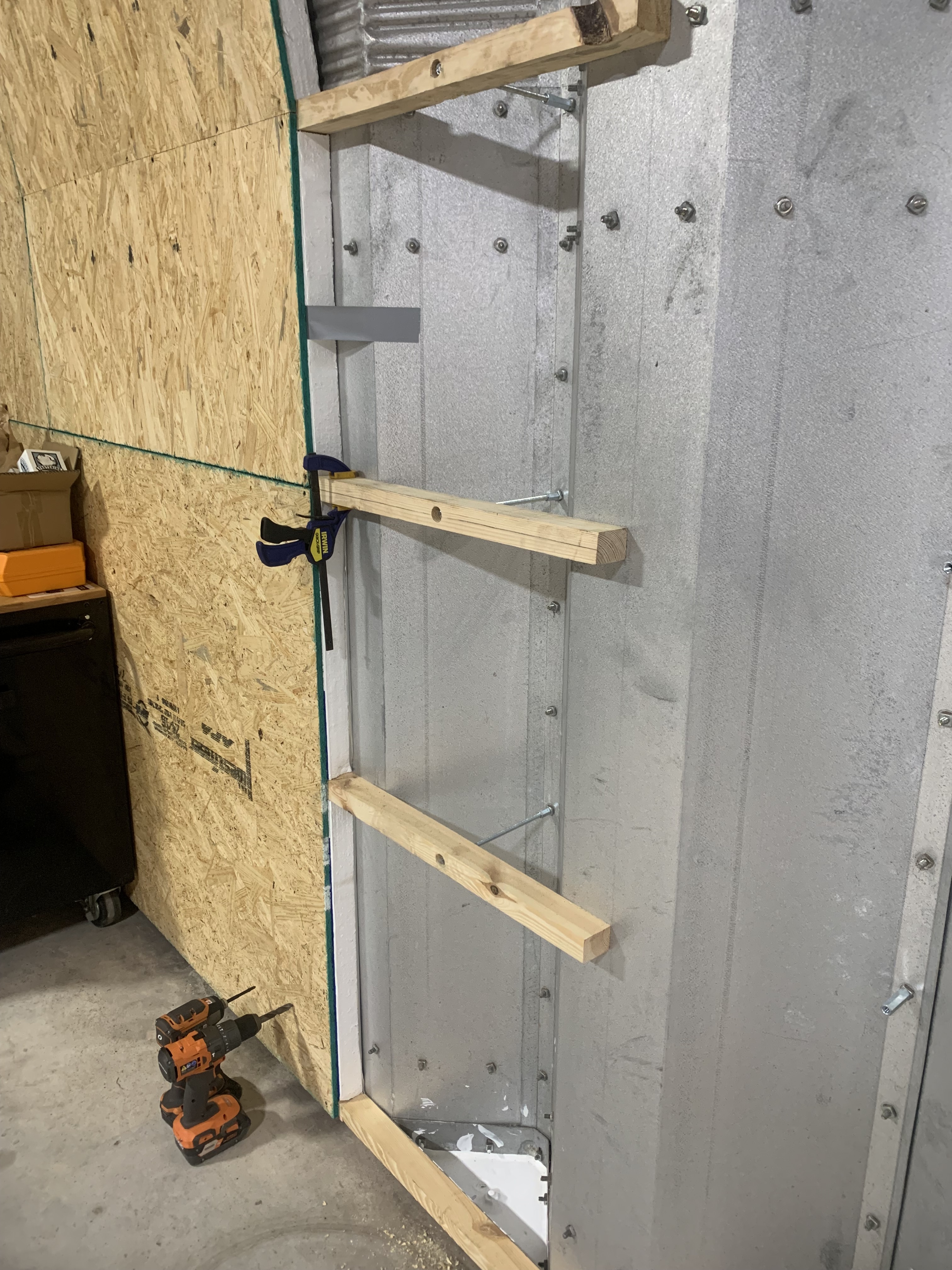 I will tell you the is was the final method chosen to install insulation. This allowed me to use the walls for hanging cabinets, shelves or racks of sorts for storage and organization. This very sturdy, I cut down 2x6’s at 2” width. This left me the 1.5” in height to attach the OSB with 3/4” between sheets os OSB to fasten with and the 2” width was for the 2” insulation. Worked very well. Now I just need to finish the other half of the building, had to stop for several projects. And now its a tad toasty for working the the day on this.