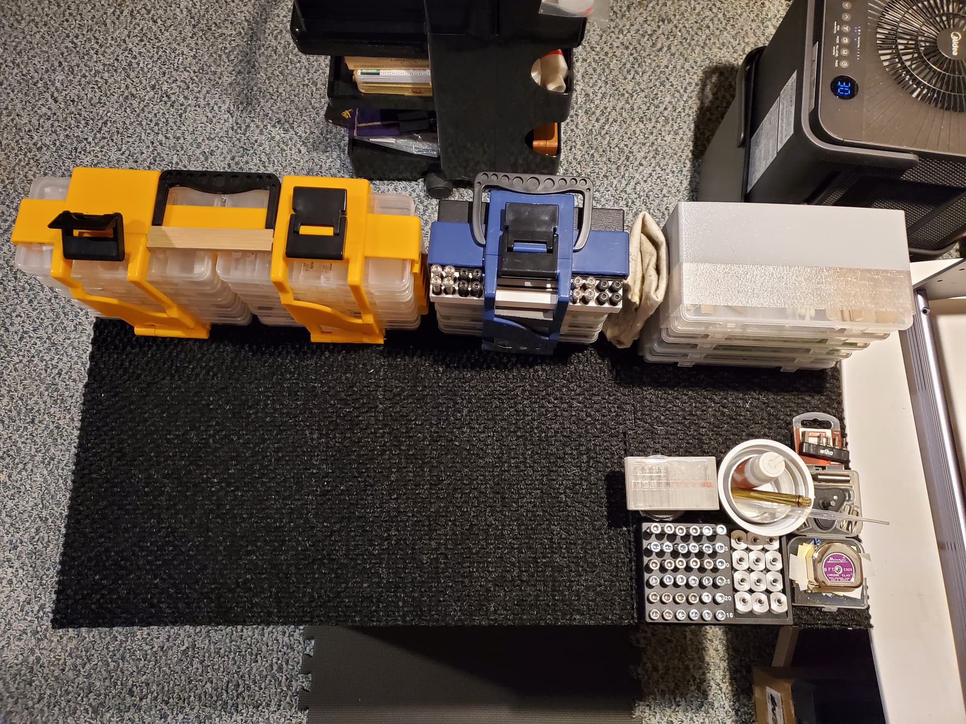 The lower left-most organizer is for current projects and probing pins, the bi-color organizer in the top-right corner is for those 6 department trays.