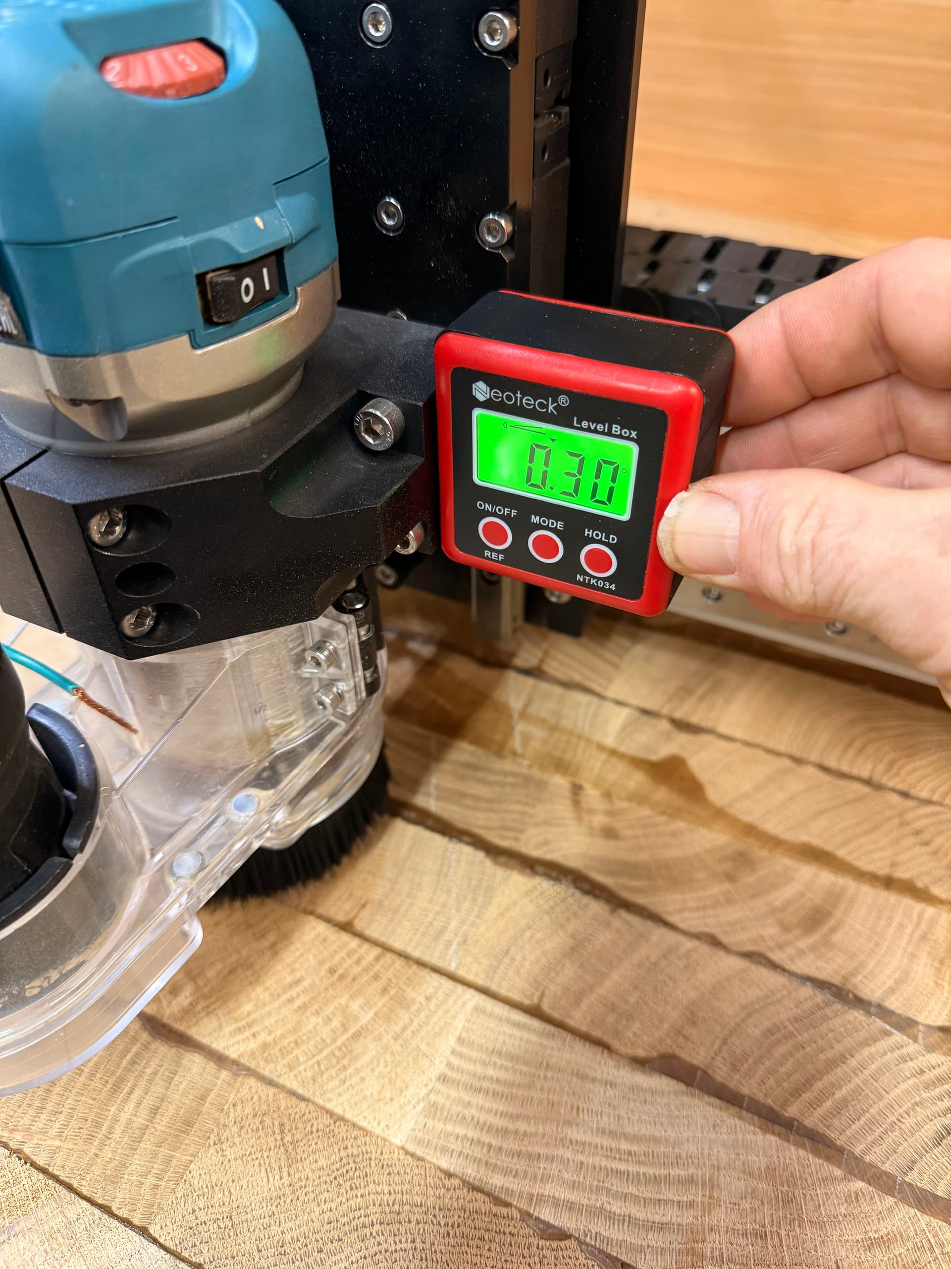 Interesting use of a digital angle gauge. You’re assuming, of course, that the router mount’s opening is parallel to the outside edges. Which, as you found it, is the case although I suspect that’s not one of the tolerance’d fit specification.