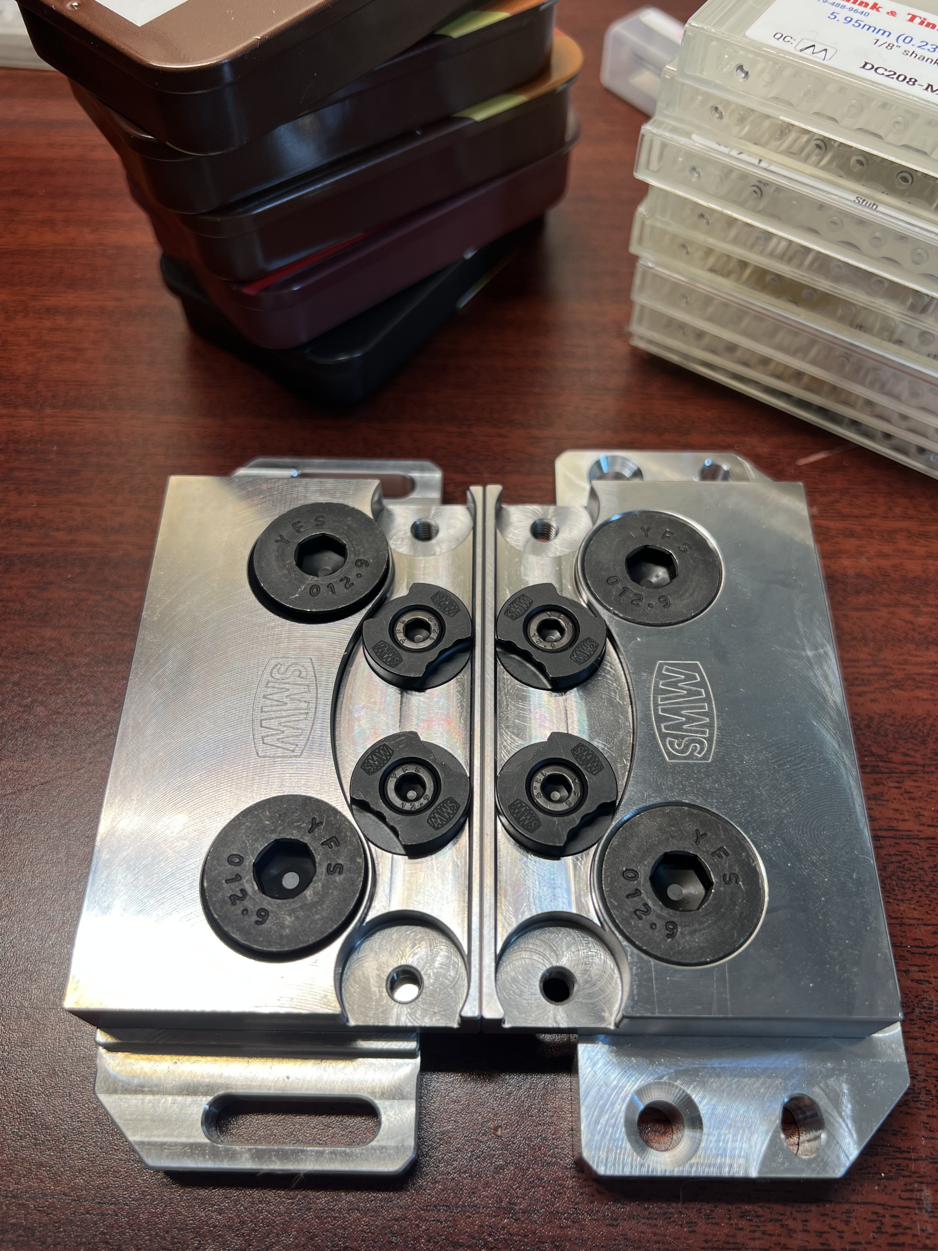 SMW hobby vise gen3 with “Turret grips” for holding various size round stock.