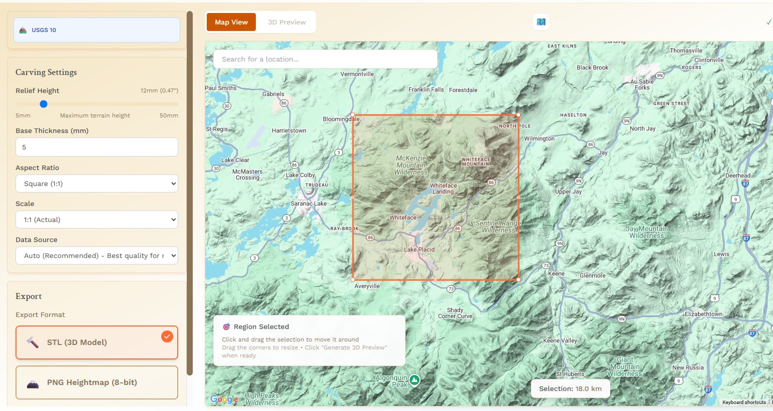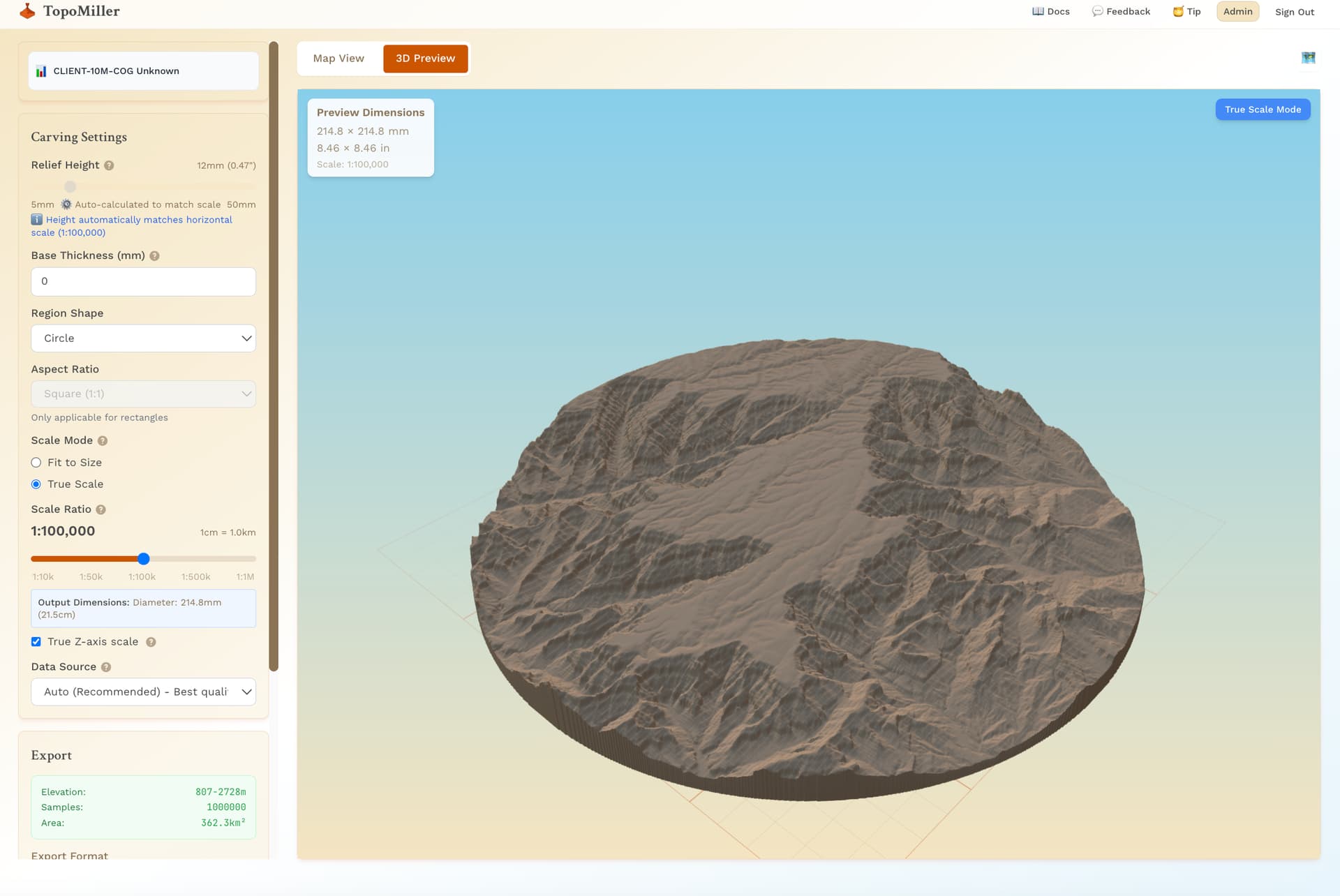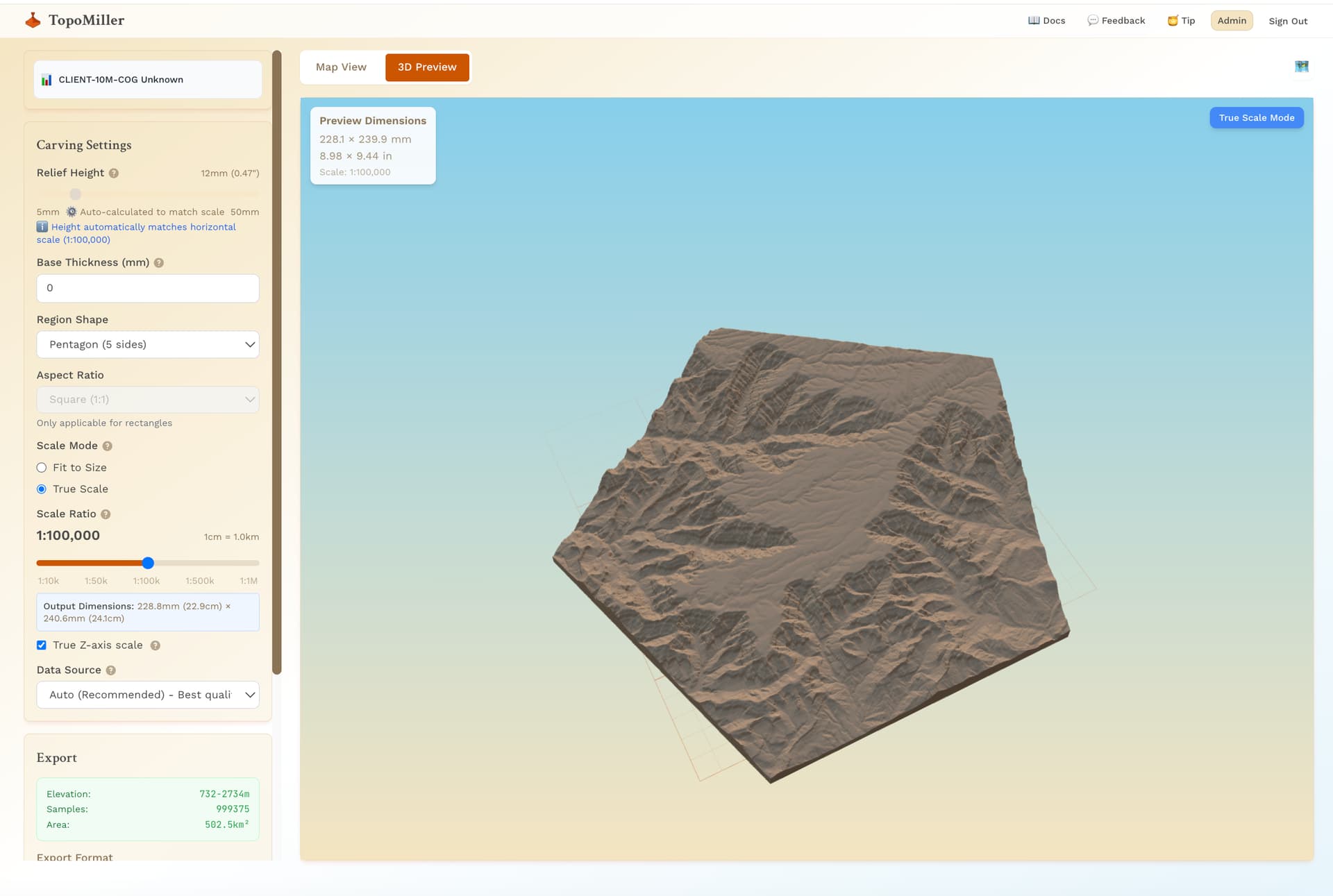 That becomes 6.3777777777777777777777777777778 mm of height on a 100 mm x 100 mm export model. The slider in the Topomiller interface only allows integer values, so I can’t use the exact scale factor.