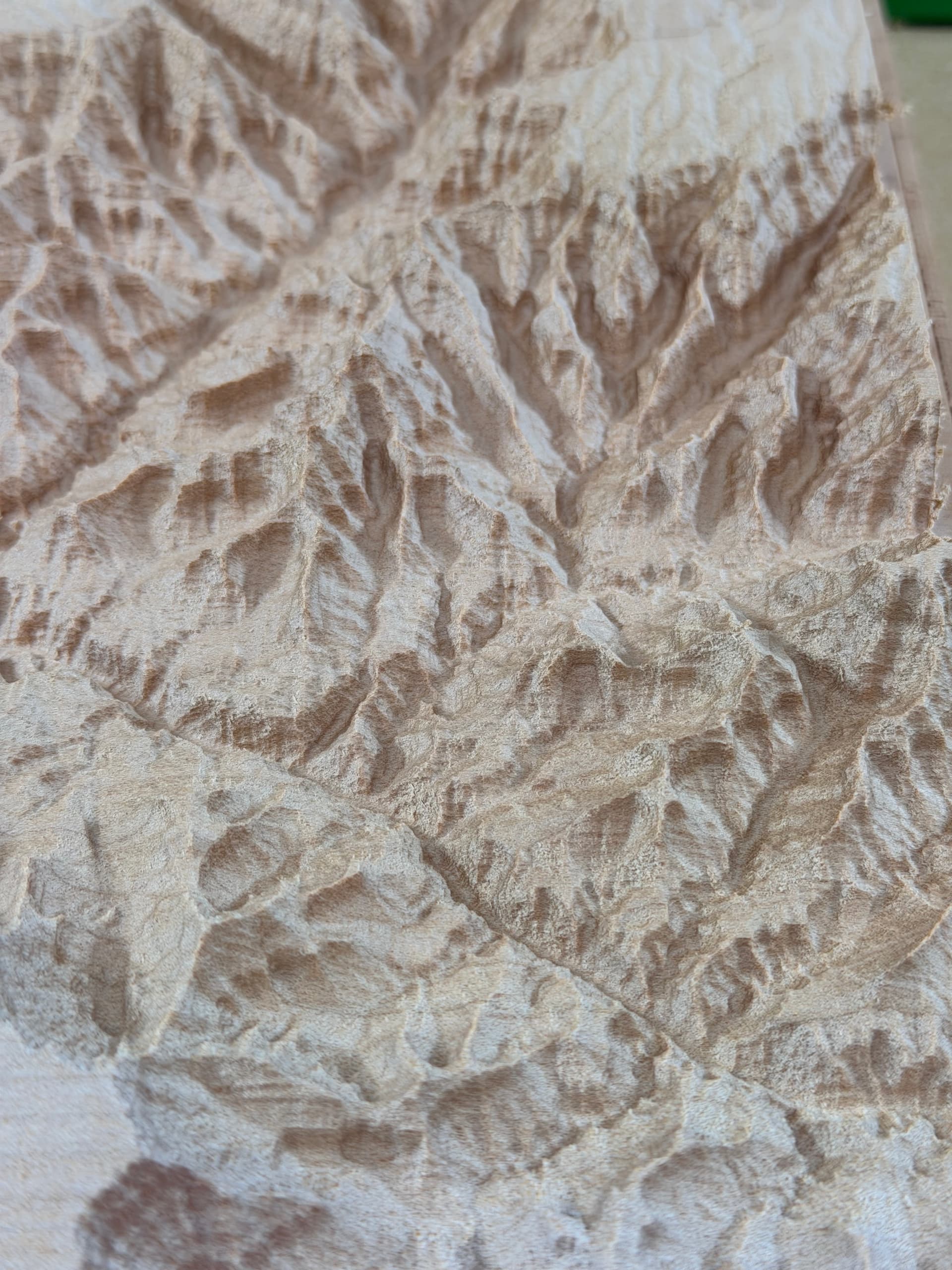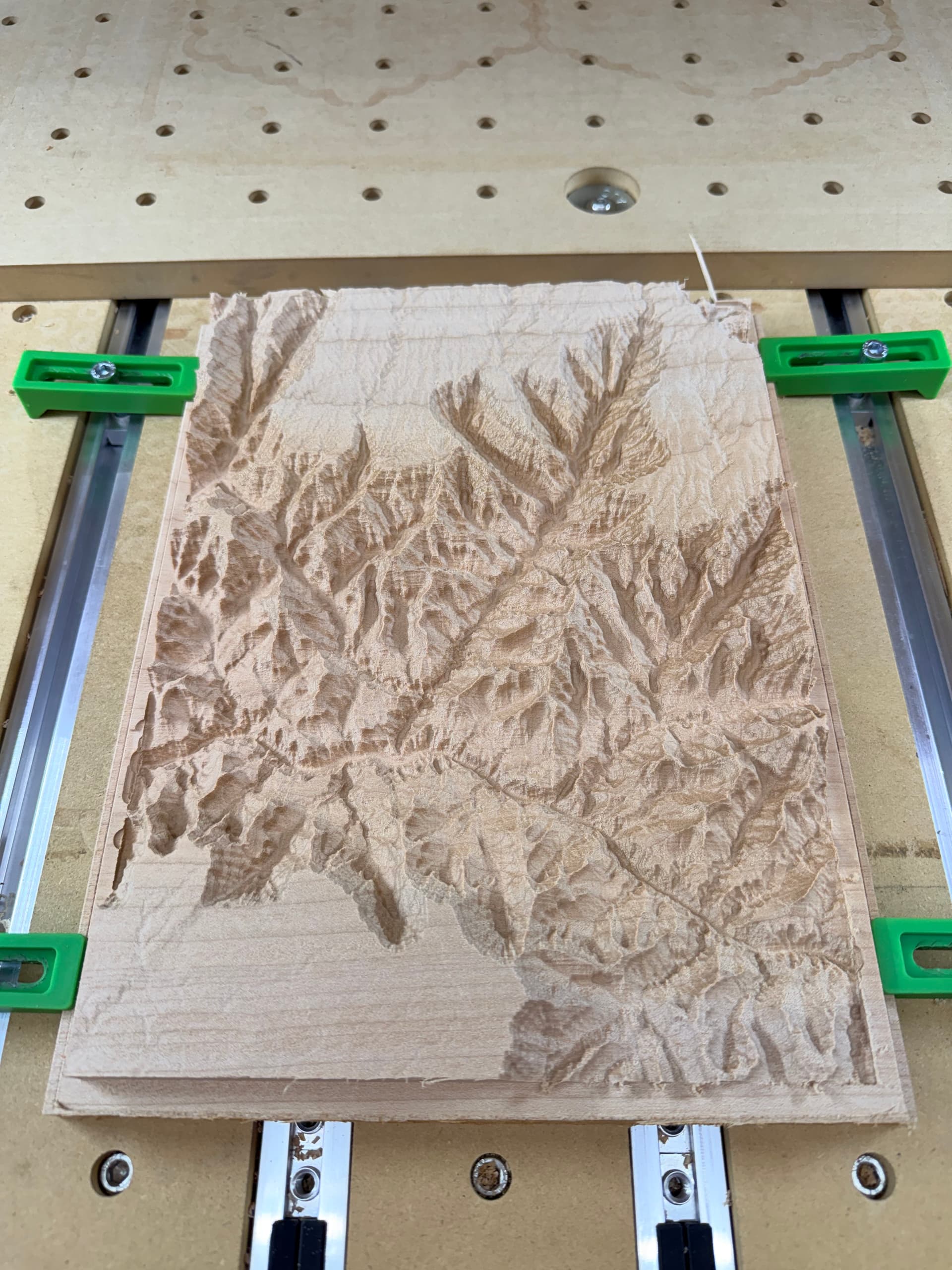 Finally got around to milling up a sample I generated from the site. Section from the Grand Canyon where we did Rim2Rim this year. I had to run two perpendicular finishing 3D paths to clean up fuzzies on the material, but that was purely a result of the wood.