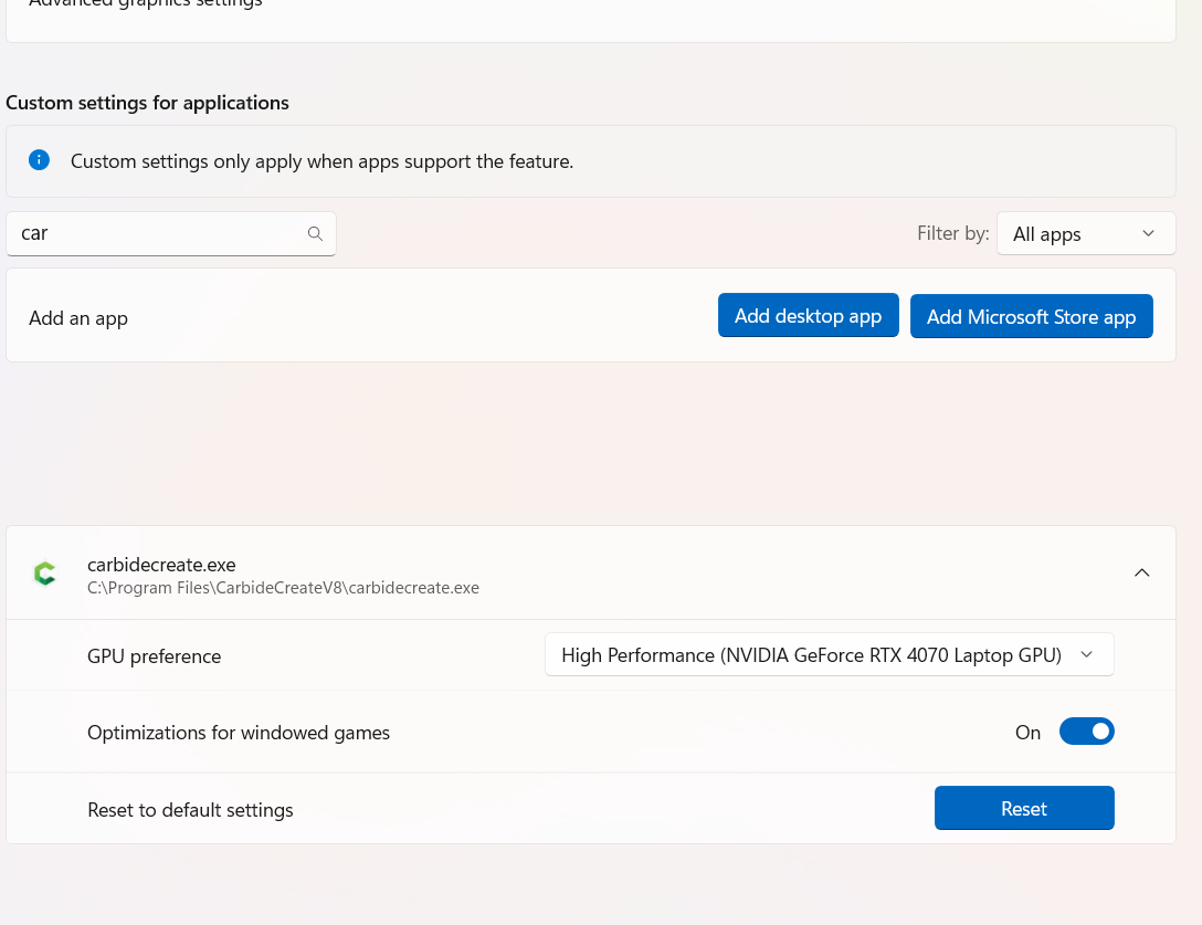 I also did what Jim suggested about the advanced GPU settings and added Vcarve to it.