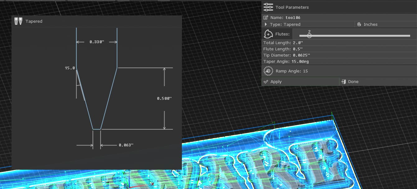 Just putting this out there: PixelCNC allows for tapered endmills with a flat on the tip, but you’ll have to define them with the taper angle (i.e. half of the V-bit angle) whereas with a proper V-bit you just put the angle of the V in the tool definition.