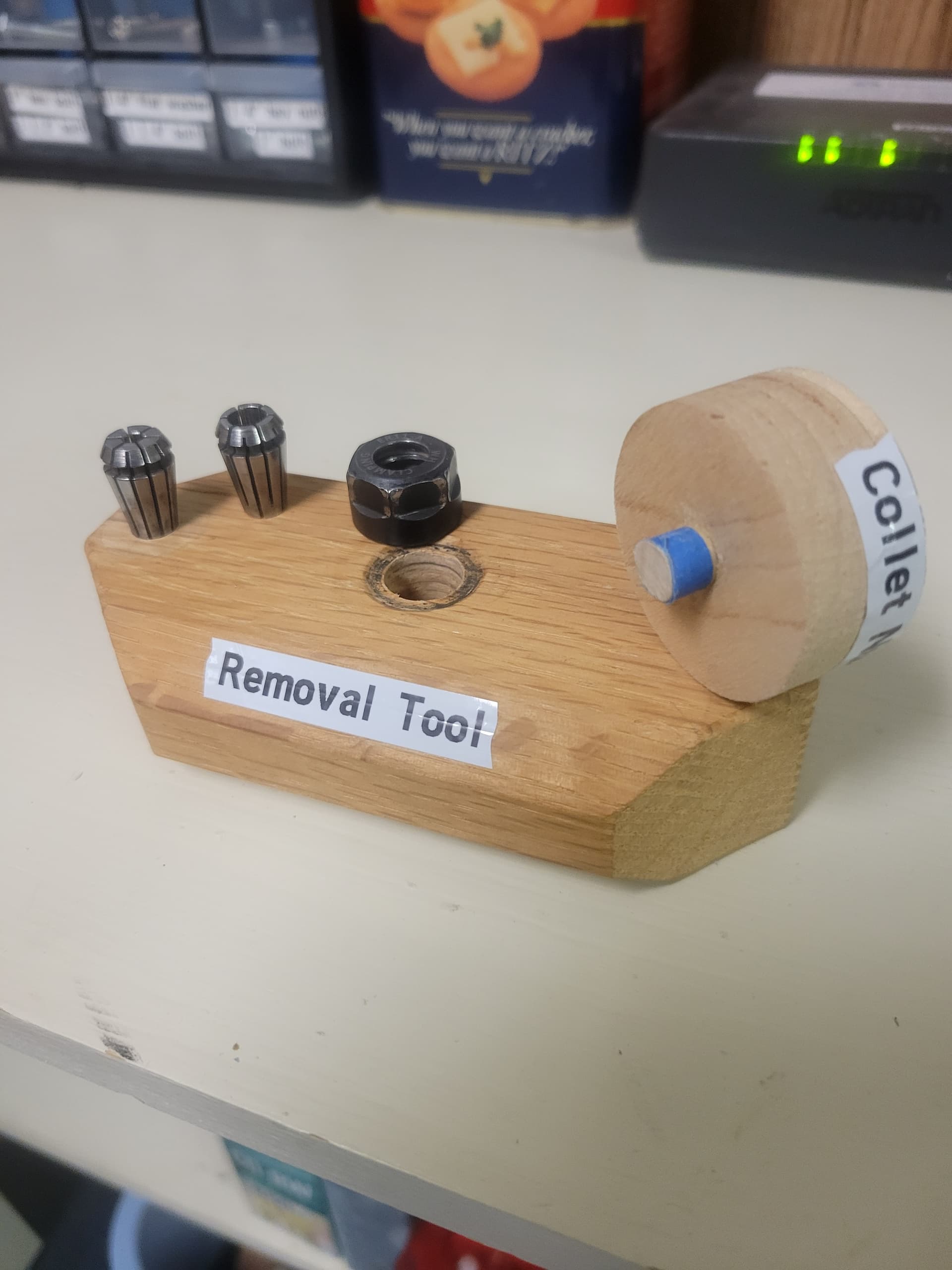 Looking on the Internet I found people using hammers, screwdrives and other questionable procedures and tools. Some suggested adjusting the collect at an angle and then gently twisting. I will owe it to my lack of intelligence, aging fingers or lack of fine motor skills that I wound up making my own Collet Removal Tool. A dowel and a round disk as shown in the photo.