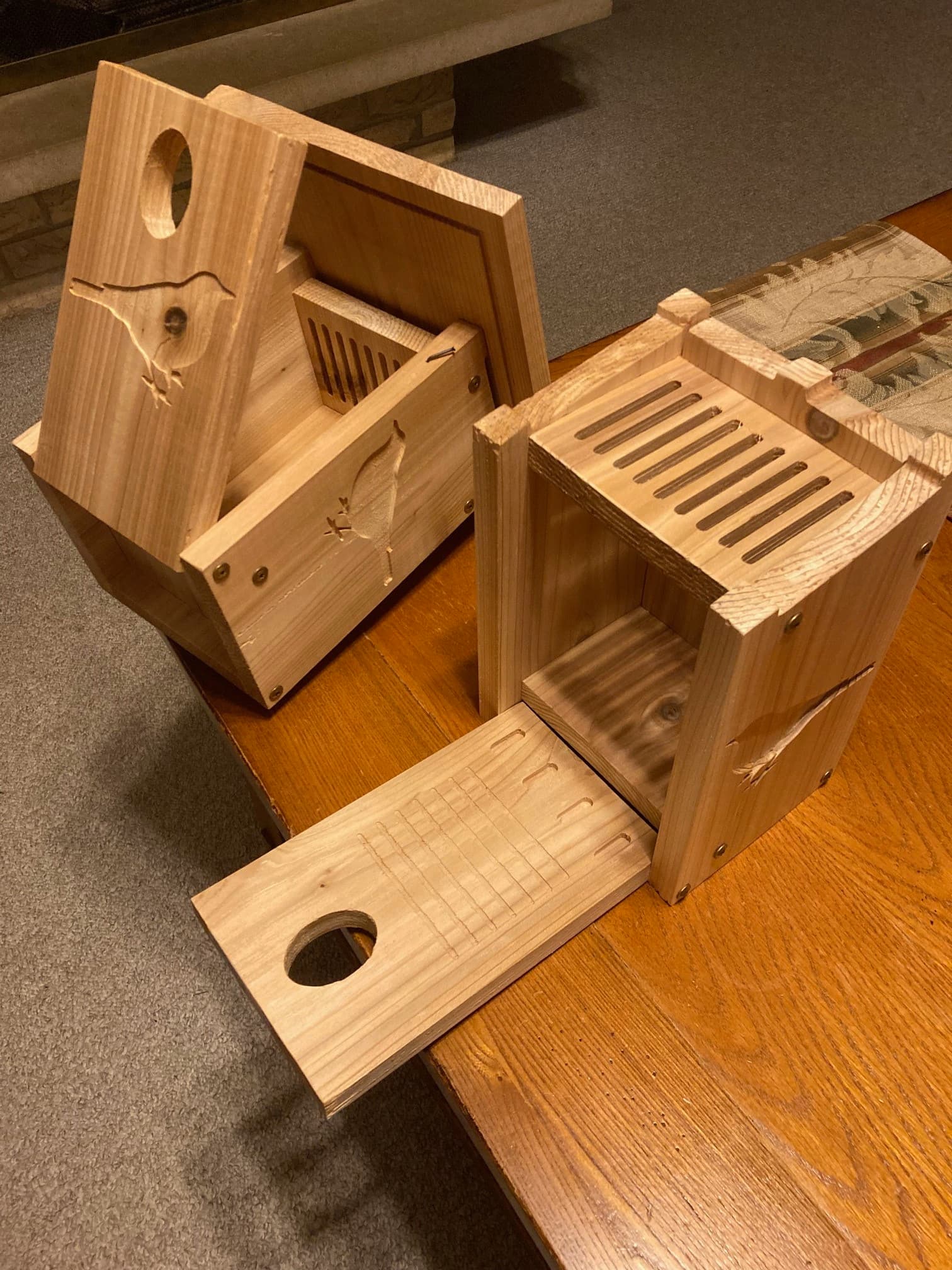 Bluebird houses (1 less its roof to show ventilation detail). 4 ft cedar 1x6 for the box and a section of cedar 1x10 for the roof. 1/16 endmill to pocket the birds. Turn over board and finish with 1/8 compression and 1/8 upcut bits. Dados in the back and blind dados in the sides to accept the floor and ceiling. All press fit. All screw holes in faces are pocketed by the shapeoko 3. Finish cuts are all done on the cnc. Tried to maximize top ventilation while minimizing water intrusion. After months and 23 toolpath revisions, finally have a birdhouse people want to buy for less than the cost of the wood