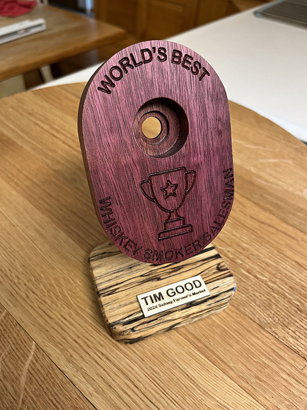 So, I decided to make him a little smoker-shaped trophy out of purpleheart since he was injured in the line of duty (burned his fingers a few times haha!)