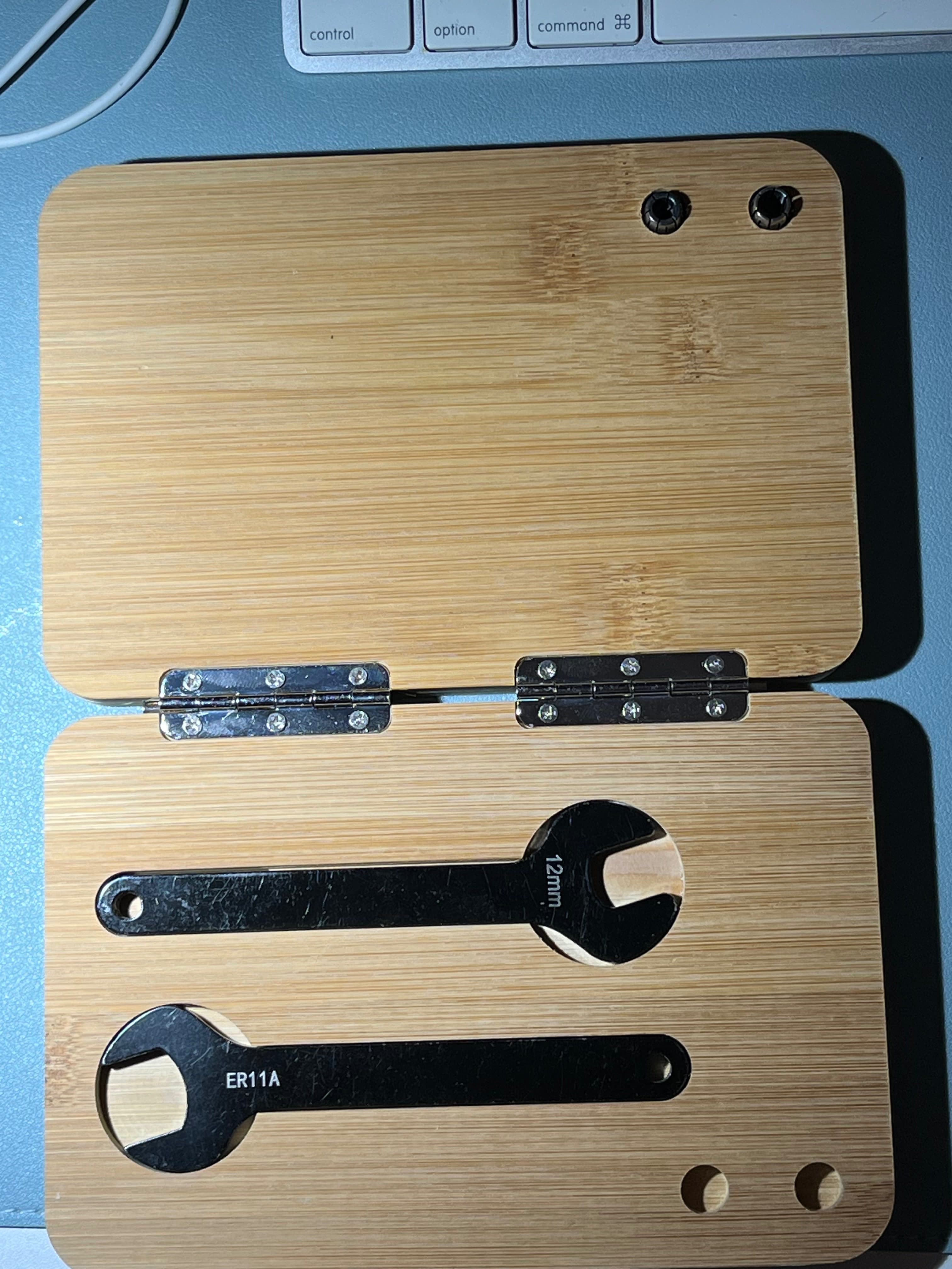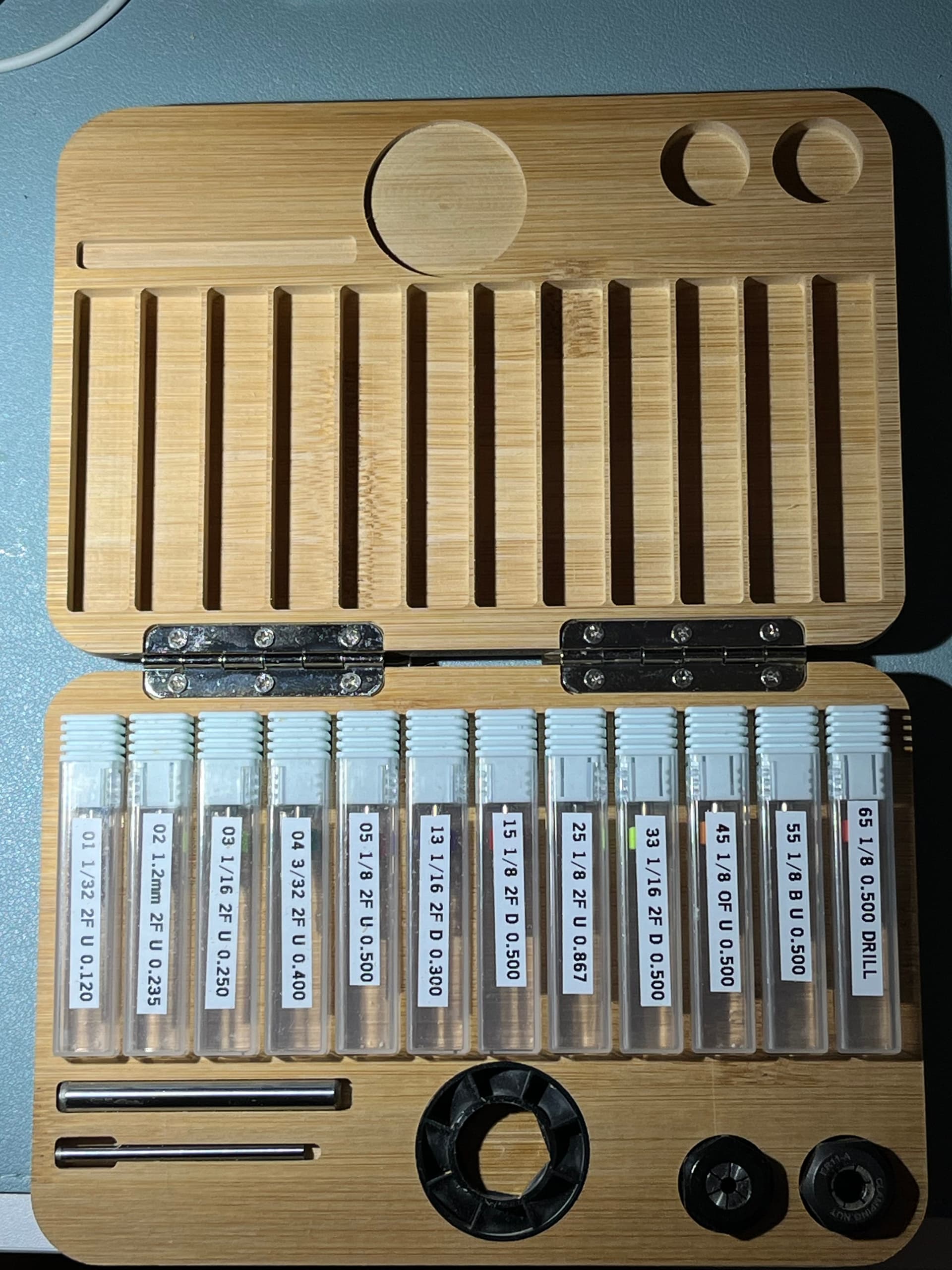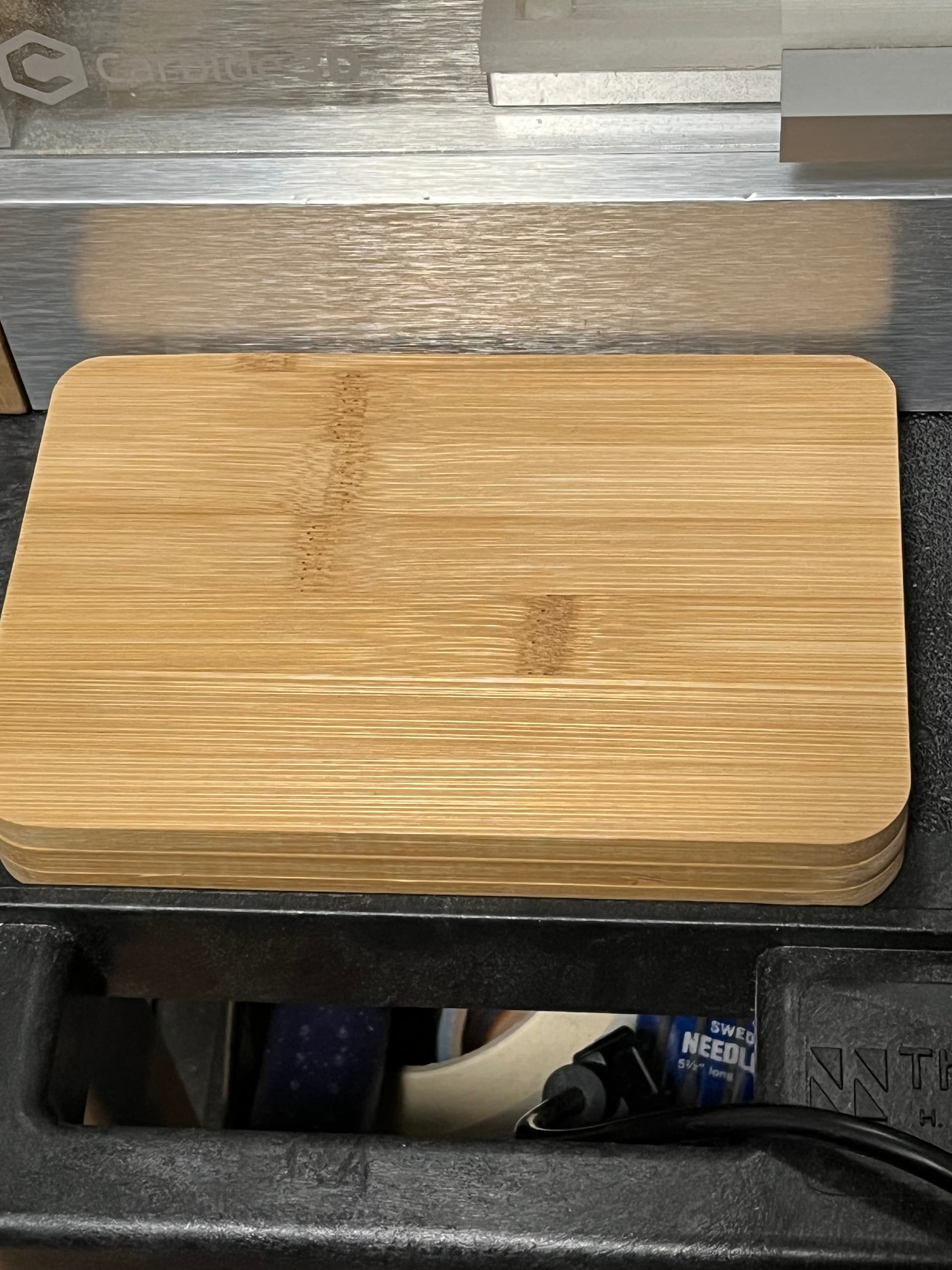 I forgot to add that the material is the Dollar Tree bamboo cutting boards. The bit holders I found on AliExpress - they turned out to be holders for bit used in nails (like on the end of your fingers, not nails like you’d use to put wood together :-)) The diameter of those drills is a little smaller than the 1/8 shank bits I normally use, so I milled a small fixture to hold five of the tops at a time and used the Nomad to widen the holes to 1/8". They aren’t solid, just 4 vanes with a gap between them. The milling slightly melted the plastic but was pushed away by the milling still stuck to the vanes. That turned out for the best as it gives a little more purchase to the shank of the bit and if it had completely cut off. The first picture shows the closed holder nestled in front of the Nomad. I had found some cards that are 18" x 24", which is a great size for the Nomad. I can roll the card out from it’s normal hiding spot to do my work and, when finished, roll it back. The room I’m using is very small (81 square feet, with two walls completely taken up by the Ikea Kallx cube units for storage), so I have to make sure everything fits and can be put away.