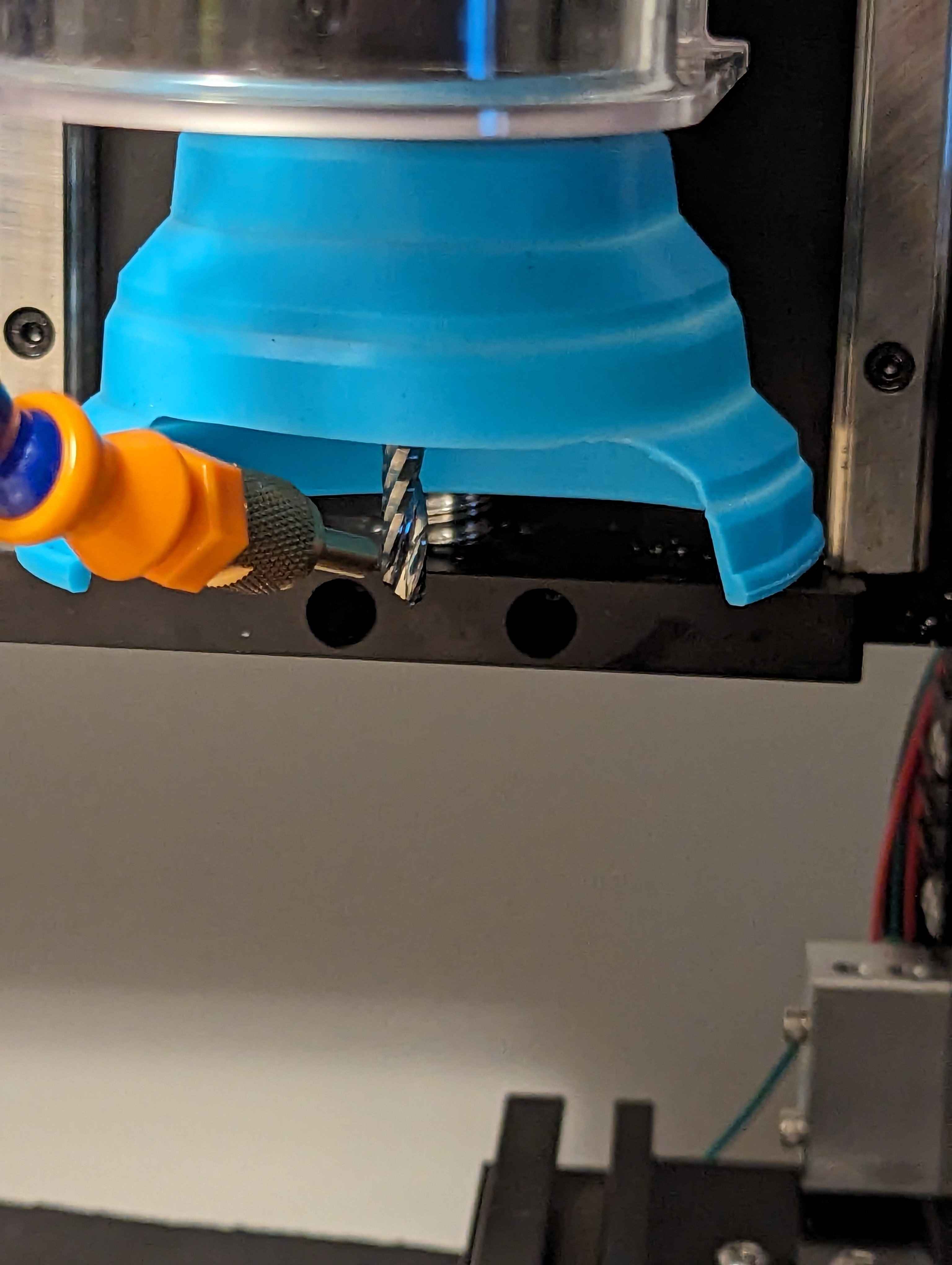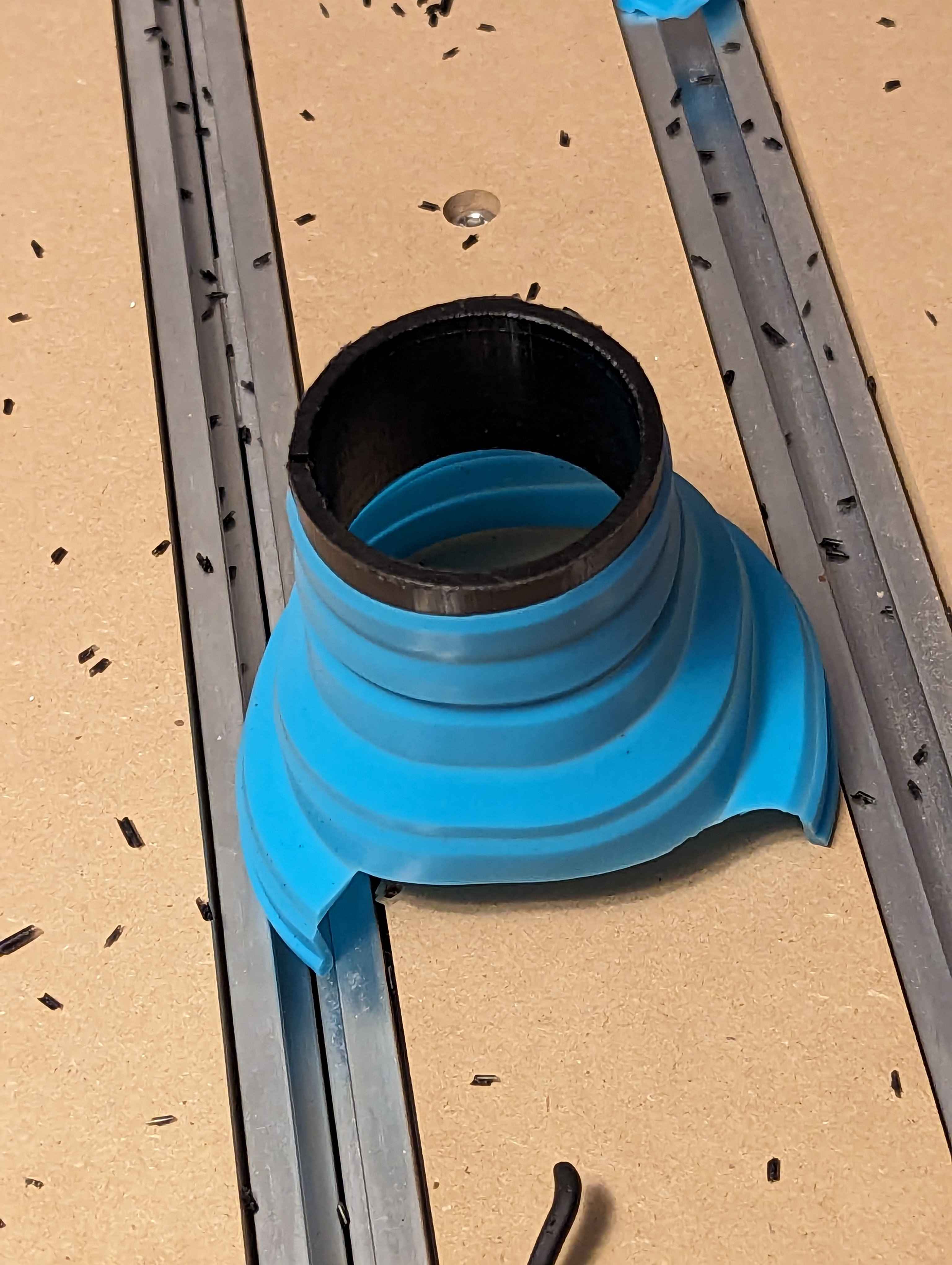 Found it buried in the forums here and added a collet so it can be used without having to move the sweepy and still holds tight enough it’s not going anywhere. The silicone would tear without the collet within 20 uses (after 3 it was showing deterioration) The collet becomes the wear point so I cut it out of 1$ in UHMW and the funnel was 3$ bringing this to a total of 4$ the other option being 400$ for a bellows for the X-axis next upgrade will be brush strips for the Y axis if I can make it happen for under 50$
