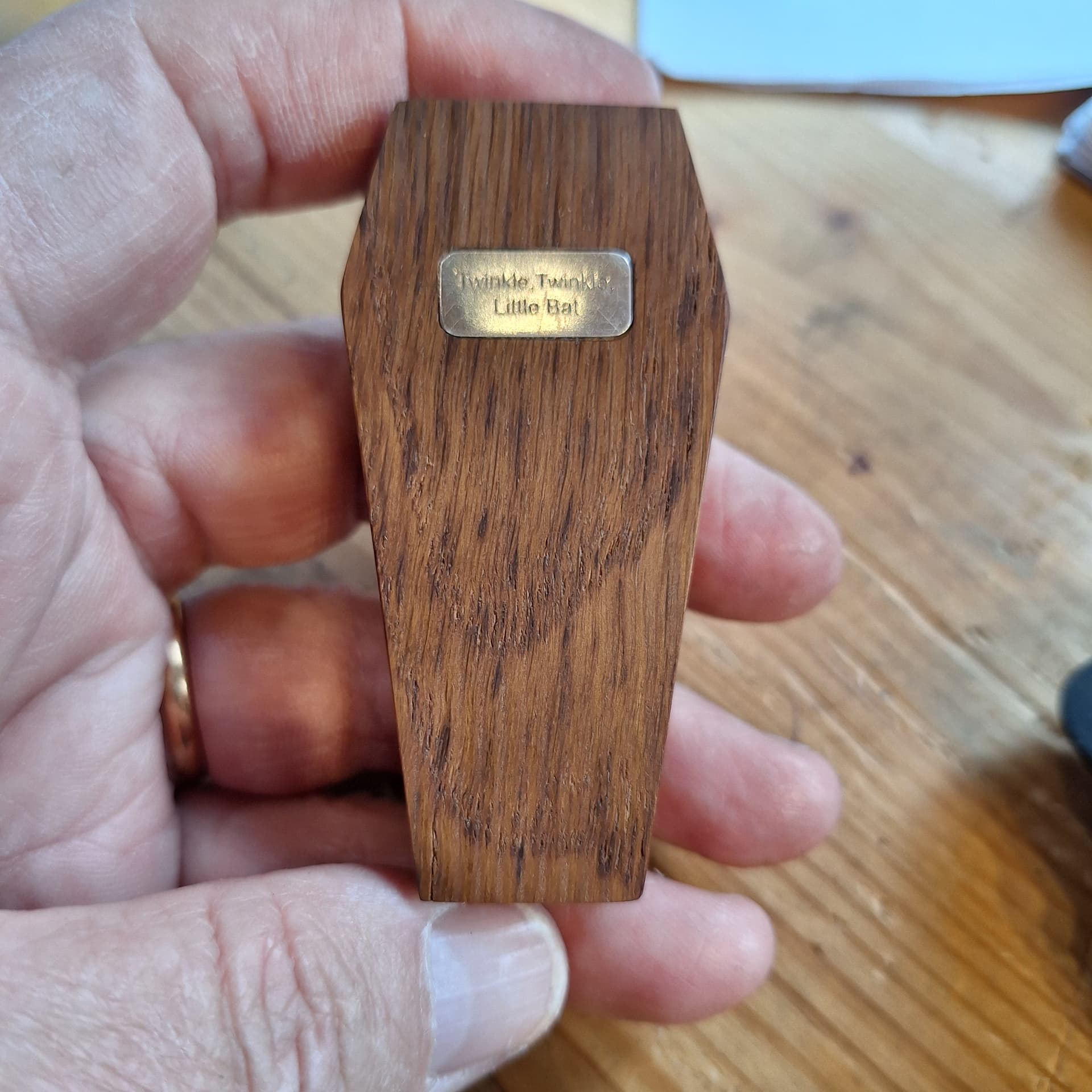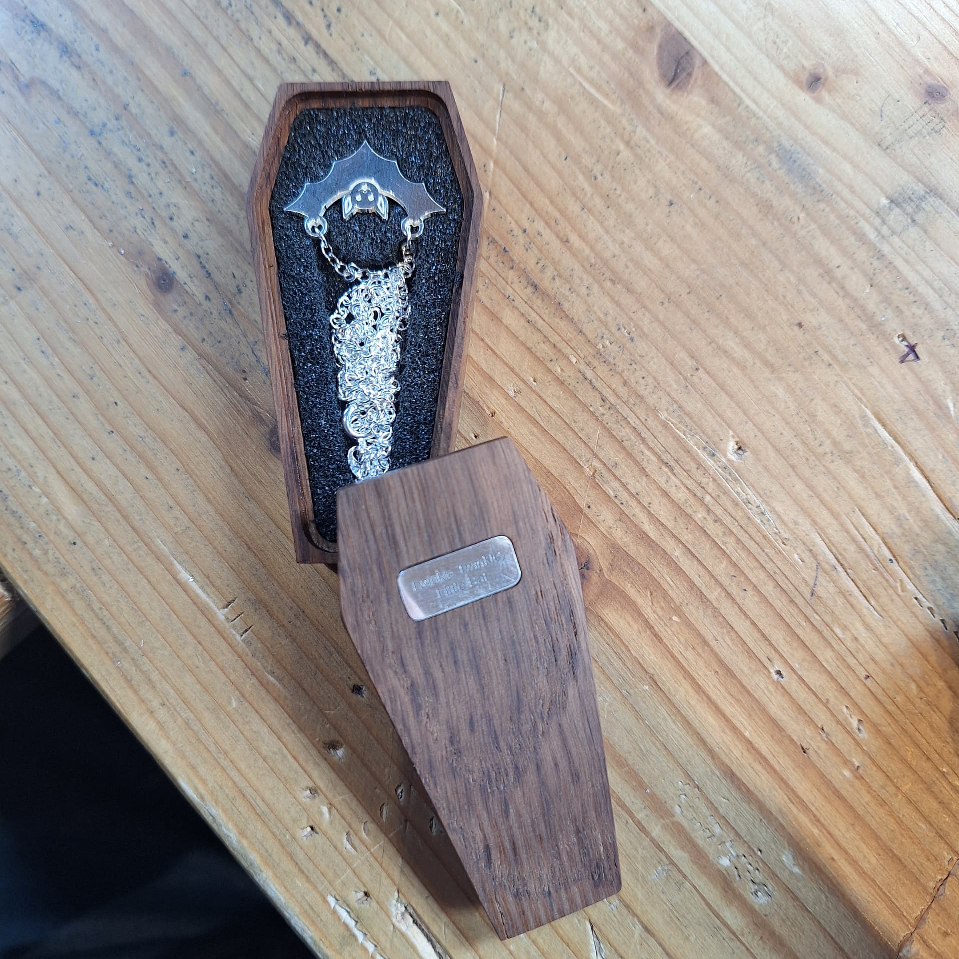 Coffin from English Brown Oak (scraps from another project, so I experienced problems with shakes appearing in the timber once carved). It was carved on a Nomad along with the foam insert (pocket to hold the bat and bat chain). I usually mill the silver to make the bat, but instead, I used my new toy, a fibre laser, to get the detail inside curves. All are designed by the person requesting the items.