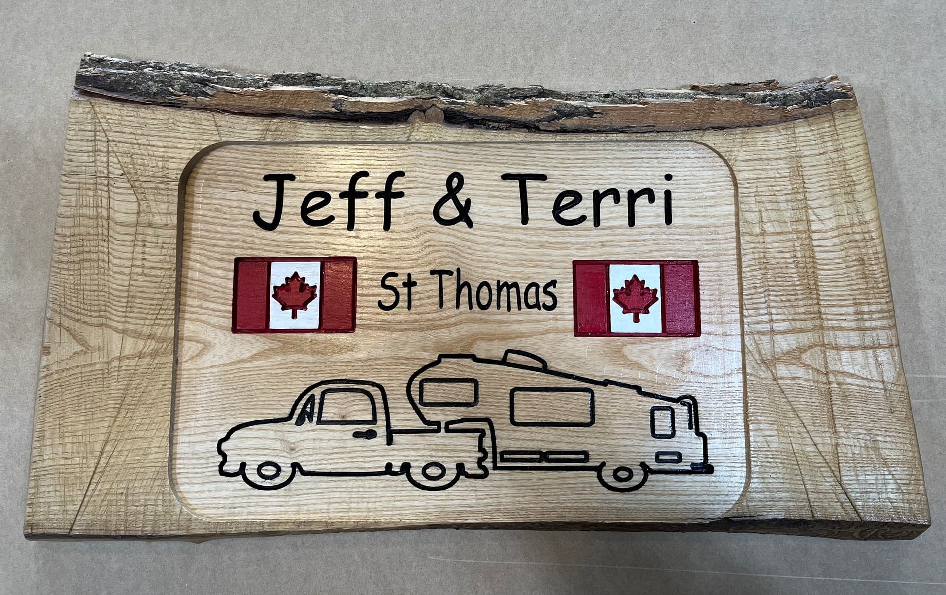 We do a fair bit of camping with our 5th wheel and see a lot of people have signs up at thier campsites so I thought what better way to use a piece of live edge thats been laying aroiund forever. It’s my first “real” project and I’m pretty happy with the final result.