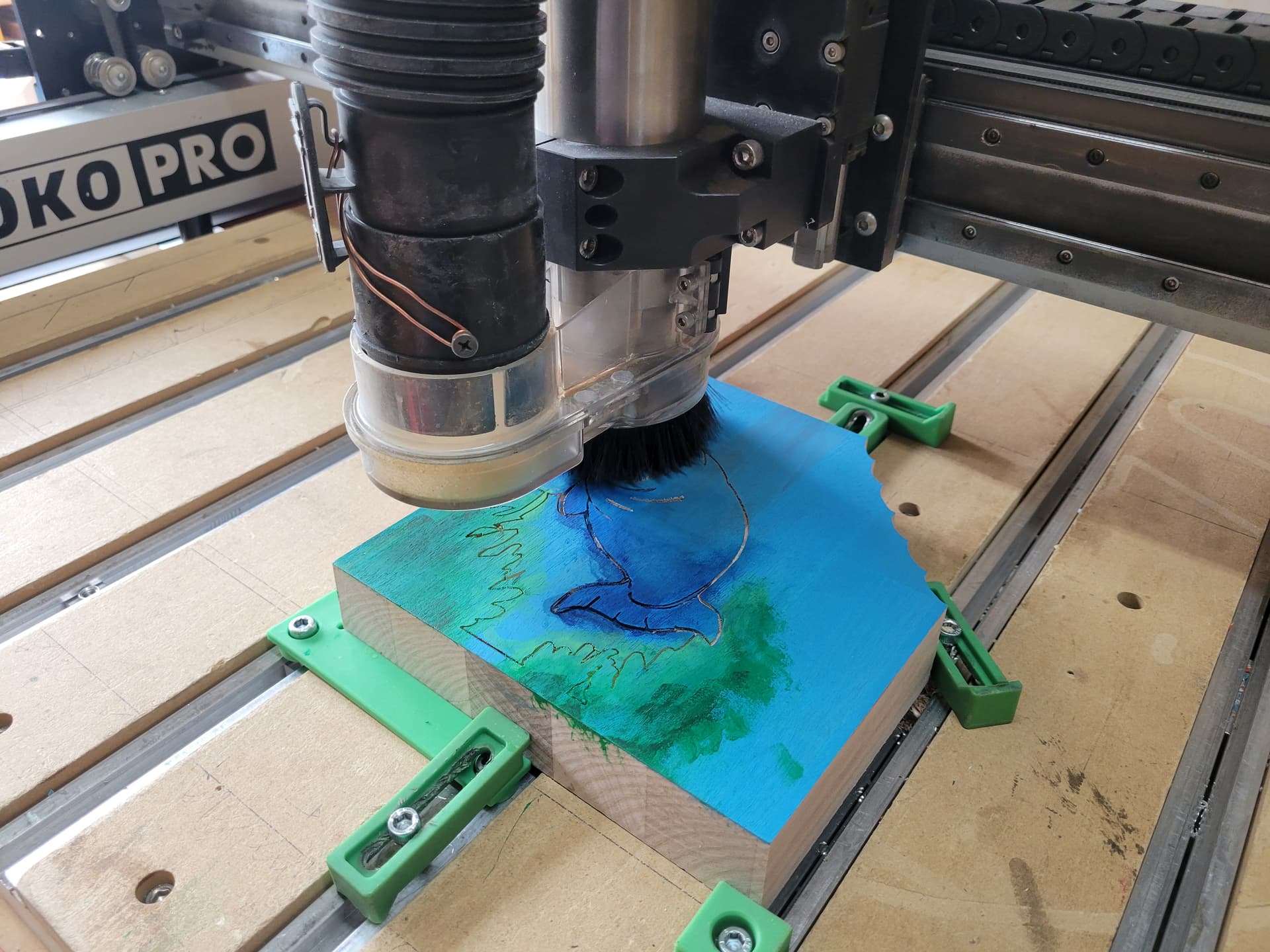 Even easier than that. I had a block of birch scrap already blue. I contoured the basic shapes at .05 depth, shaded in the lines, and then ran the project.