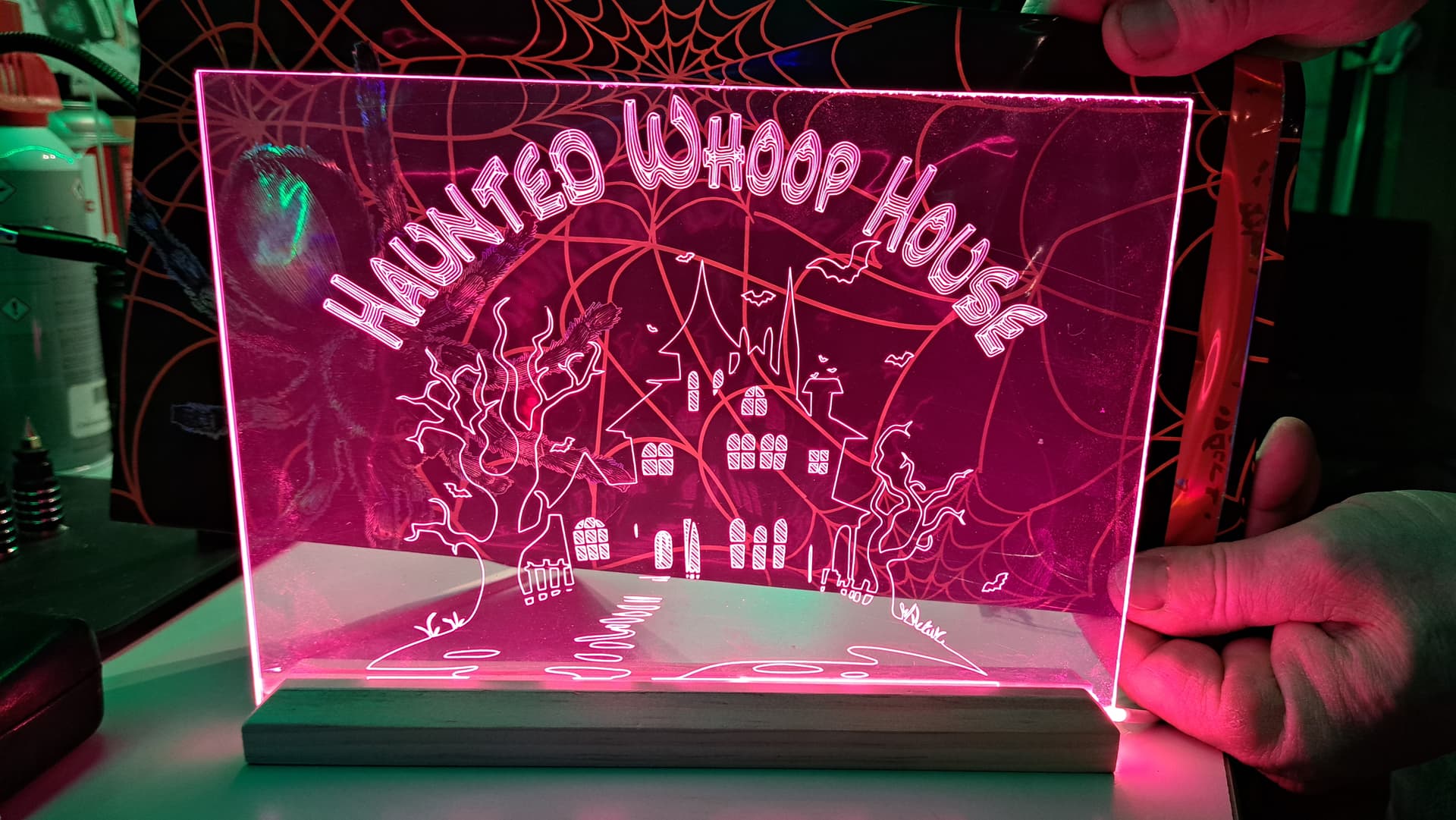 I just made a lighted acrylic sign for a friend. We fly micro drones all winter in his detached garage, which he calls his haunted whoop house. This is my first time doing a lighted acrylic sign, and it turned out nice. I’ll be doing more.