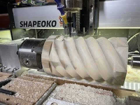 The video shows it cutting a piece of Cherry to make a lamp base. Cut from a felled tree on my land, air dried (ish), rough-turned on my lathe to get a 120mm (circa 5") blank. Created a twisted pentagon design in OnShape which blends from a circular base to a pentagon-ular (?) top as this both looks nice and also presents a number of rigidity challenges that prove or disprove my machineās new axis.