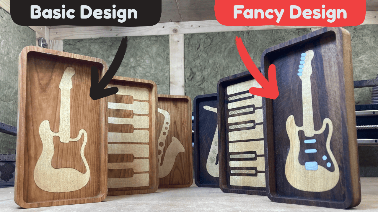 Hi everyone, I’ve made some musical instrument trays on my SO5 with two types of design - a basic set in cherry, then a fancy set in walnut using metal inlays.