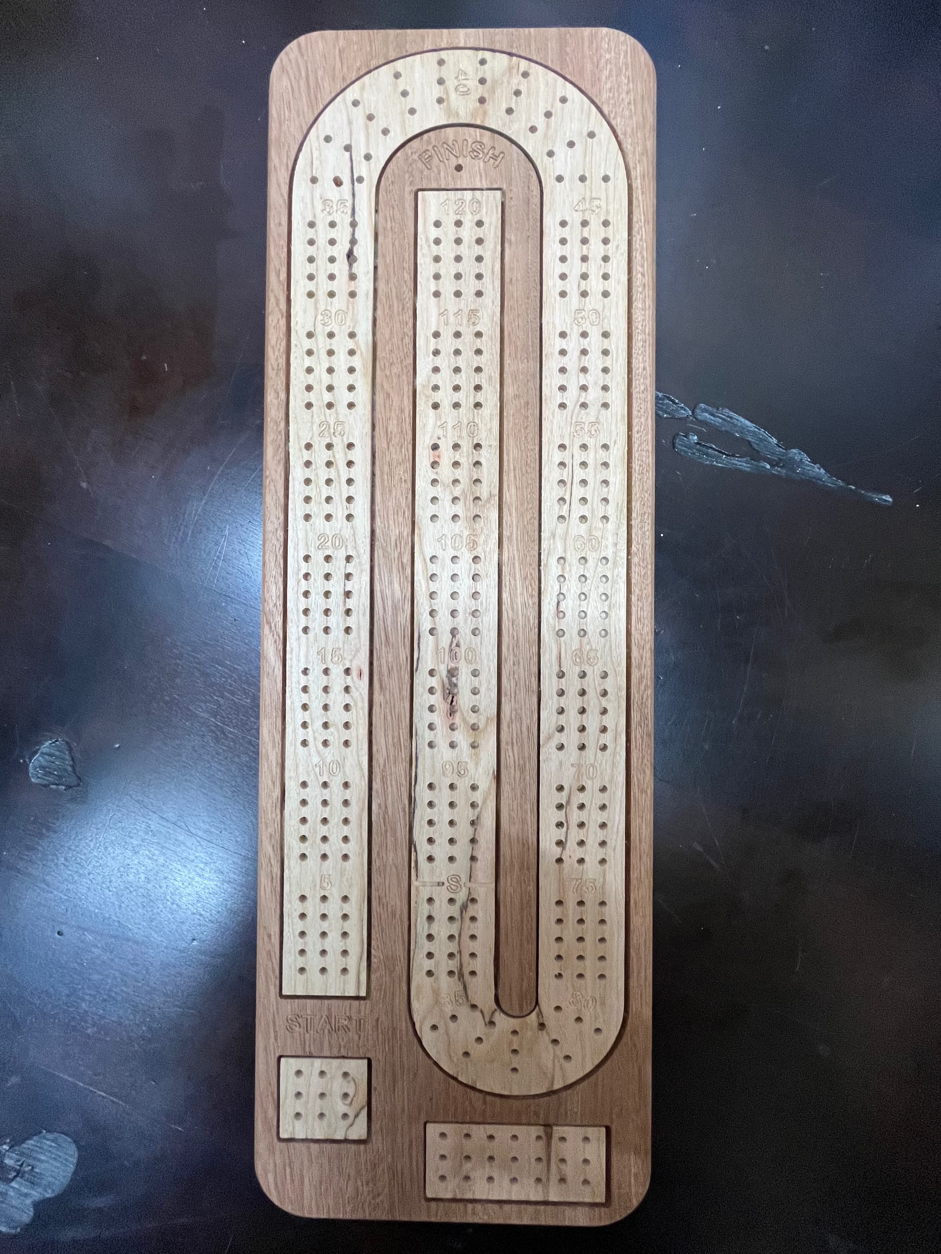 Here’s my first attempt at an inlay crib board. I used a piece of mahogany (from my previous score acquisition) with cherry inlay. The contrast turned out good between the two. You have to look close to see the numbers and start / finish wording so that will need some adjusting so they stand out better. Don’t mind the shadow at the bottom of the pic, my lighting wasn’t that good