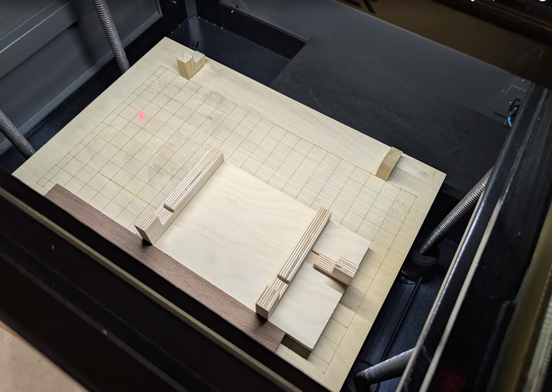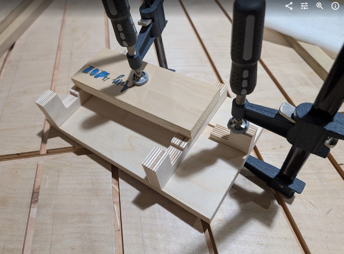 Shallow pockets are made into the baseplate to aid accurate positioning of the risers. Also helps during glue up.