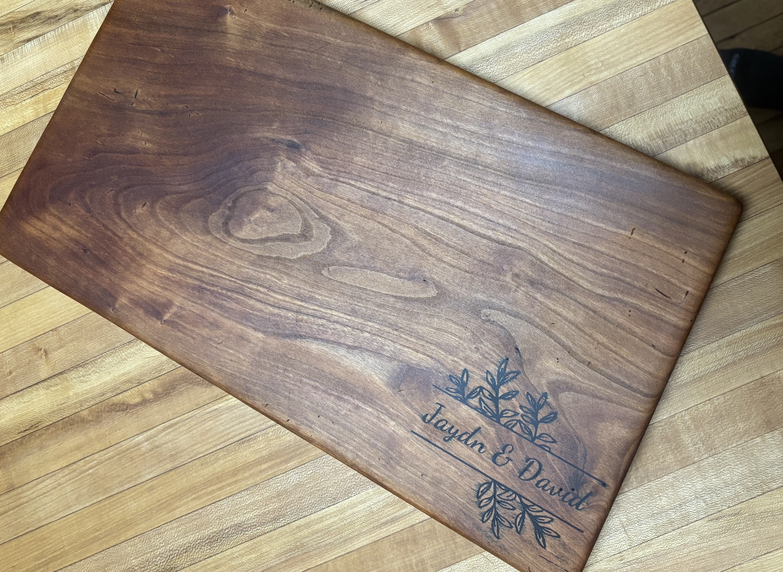 First attempt at a personalization. I’m going to an engagement party and decided to plane down a Cherry board, chop off a good chunk, sand and rout it, and carve their names with some “extras”.