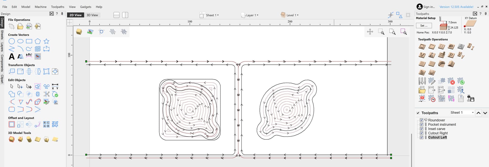 For the work you have around these letters with the smaller scrap pieces around the letters, it might be best to actually program your machine to cut that material completely out instead of a contour and then having to go through and cut off every tab and sand the remains of what is left. The bigger waste pieces can hold a good tab and would be wise to do so, but the little areas can be completely cut out, which would sacrifice some time instead of a complete design failure and/or tool breakage.