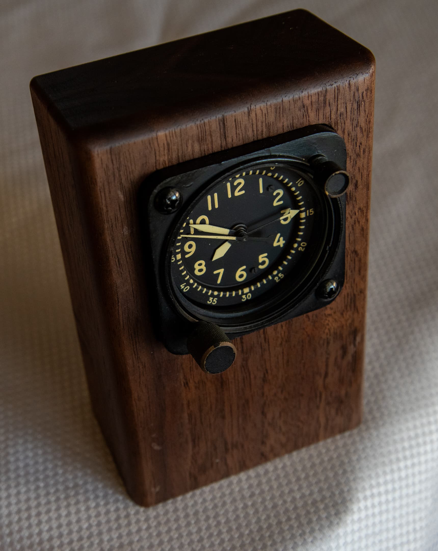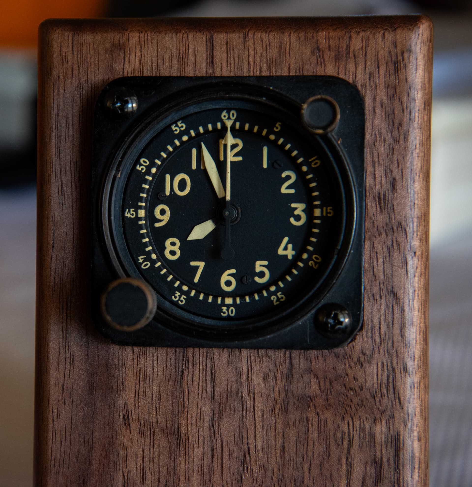 I finally finished a little aviation desk clock I have been pondering for some time. I wanted to take a genuine old mechanical aircraft chronograph and convert it to a desk clock. It’s pretty easy to find these old 2" Waltham A-13A clocks which originally came from military aircraft, but were probably used in civilian aircraft as well. If you want a working model, I suggest getting one in non-working, but serviceable condition and having it serviced as this way you start with a clean slate that should work well for several years. I got mine on eBay for $200. I spent another $150 getting it serviced at Historical Aviation Supply. It works wonderfully after servicing and keeps perfect time, although I did have to make a slight adjustment to the timing, which is typical when a mechanical clock is shipped. This particular clock is a chronograph. On the upper right control you press once to start the chronograph, a second time to stop it, and a third time to reset. Winding it fully gets you about one week of operation, but I typically wind it every other day or so.