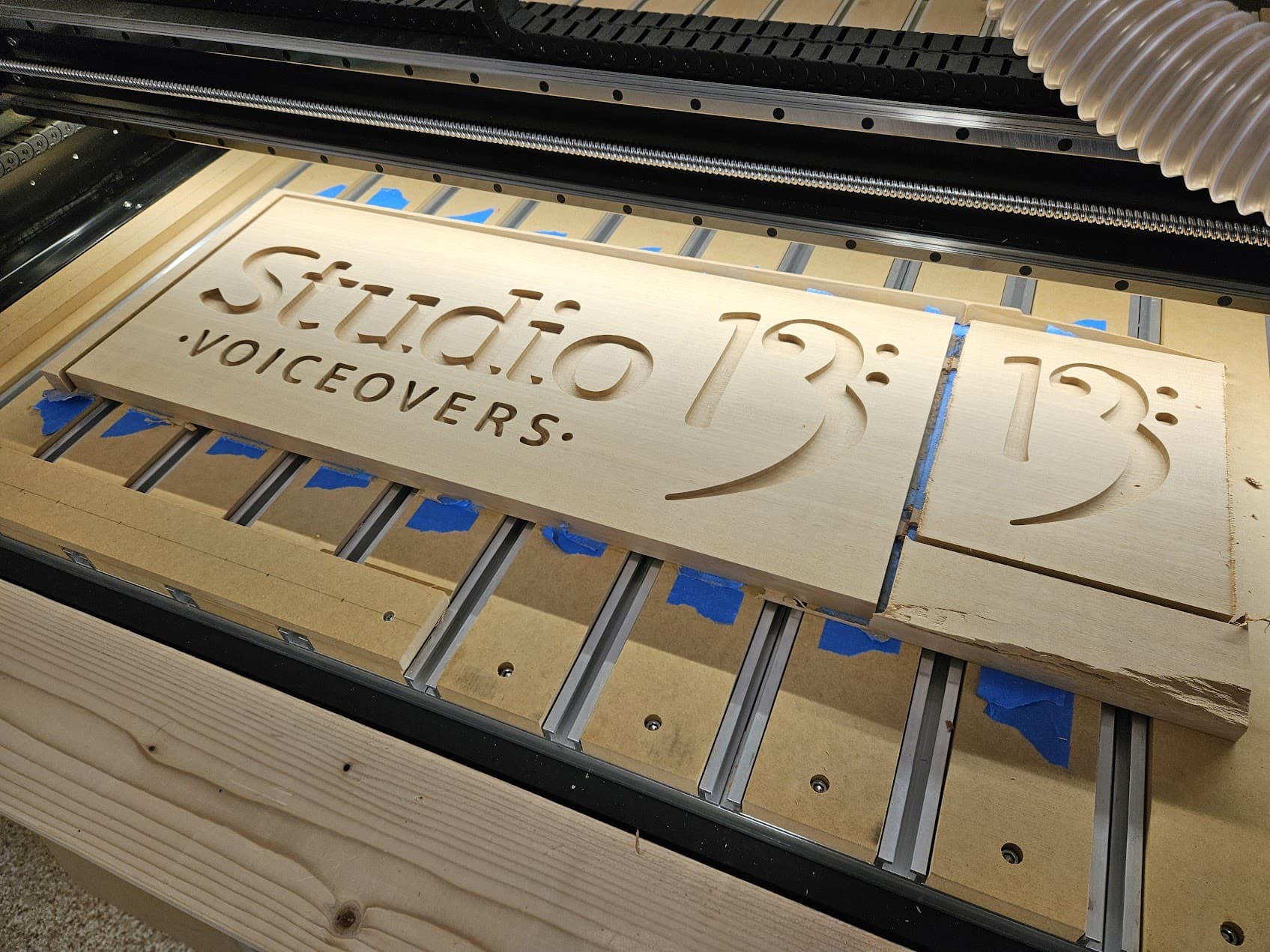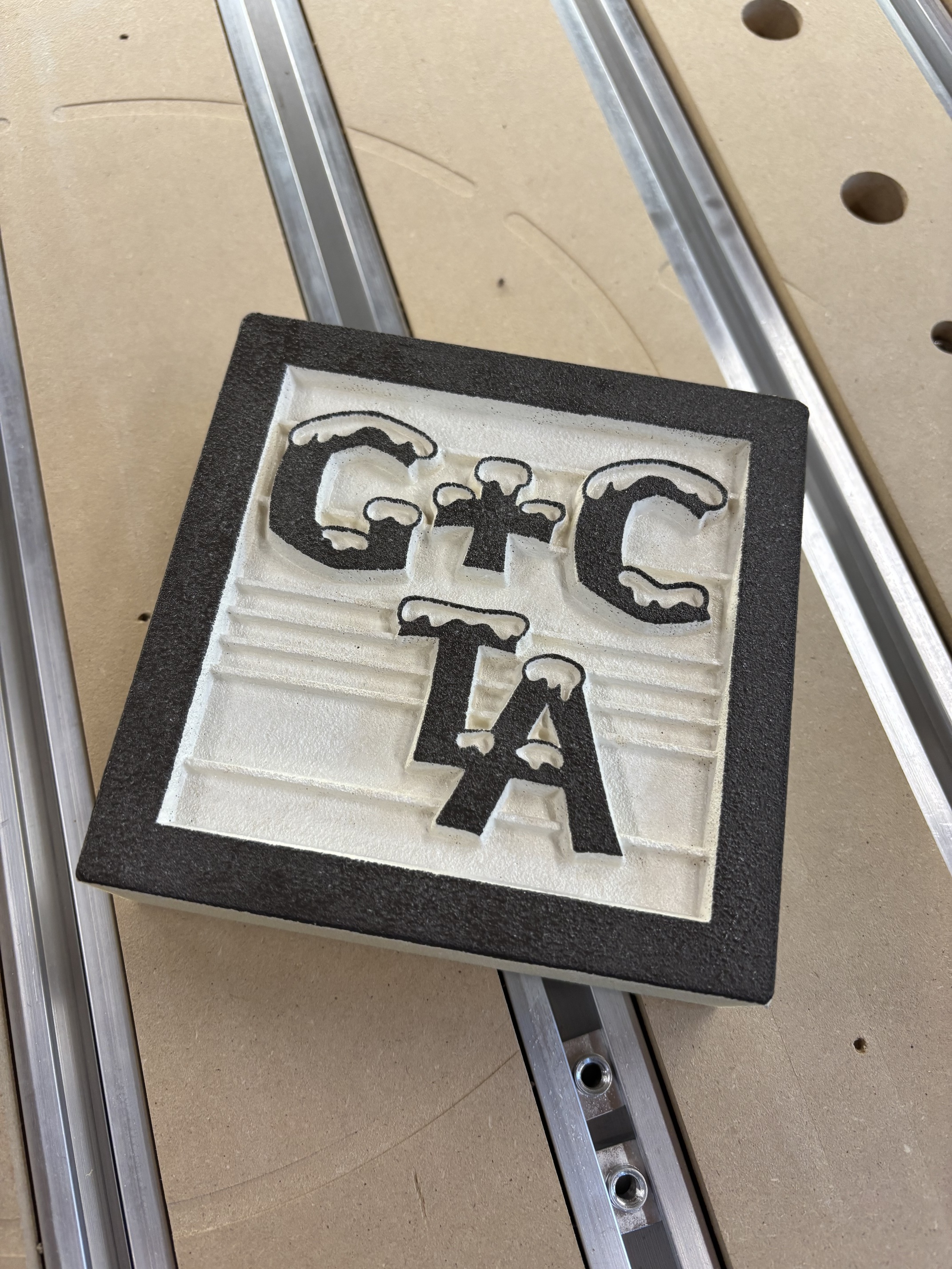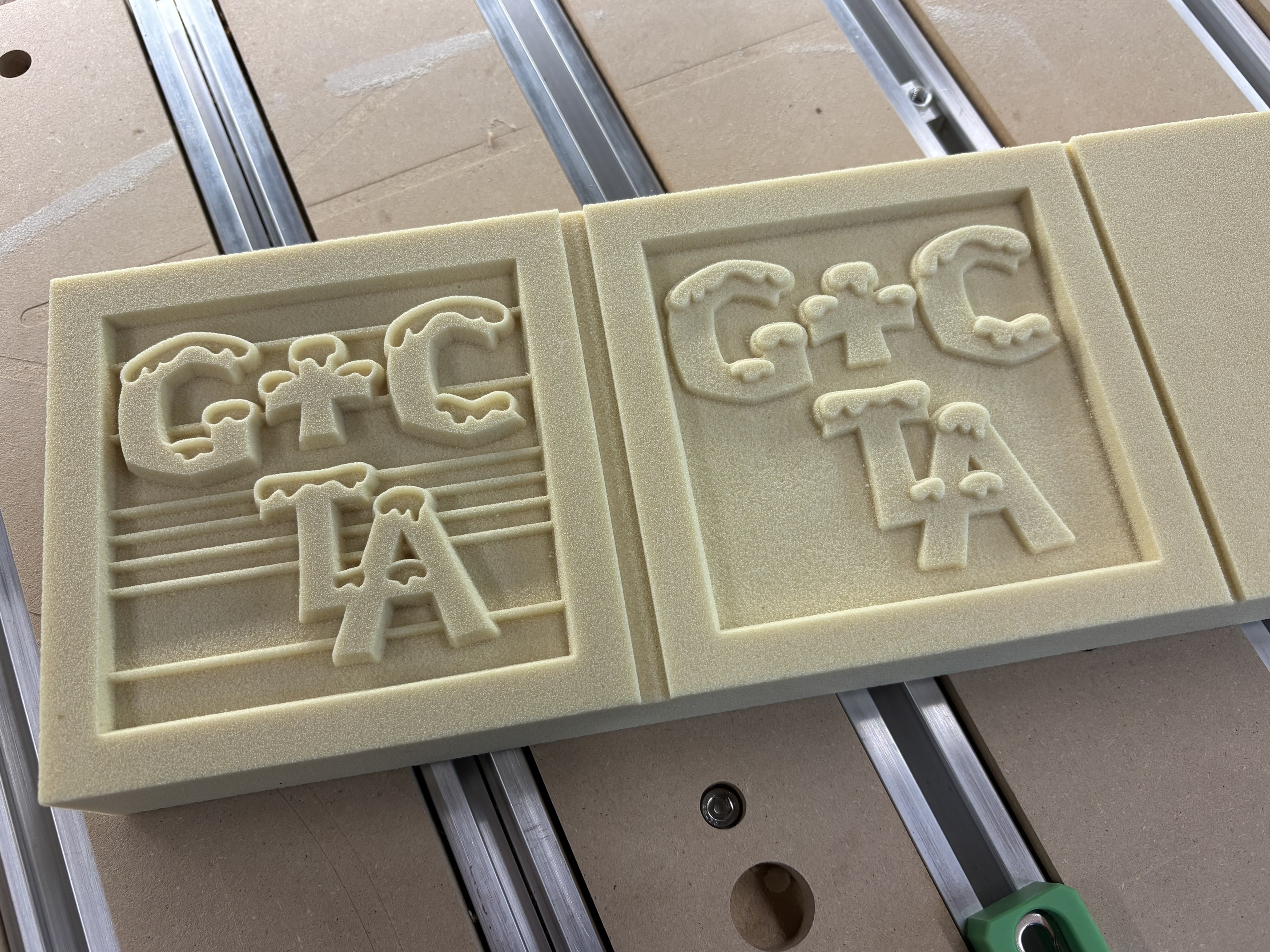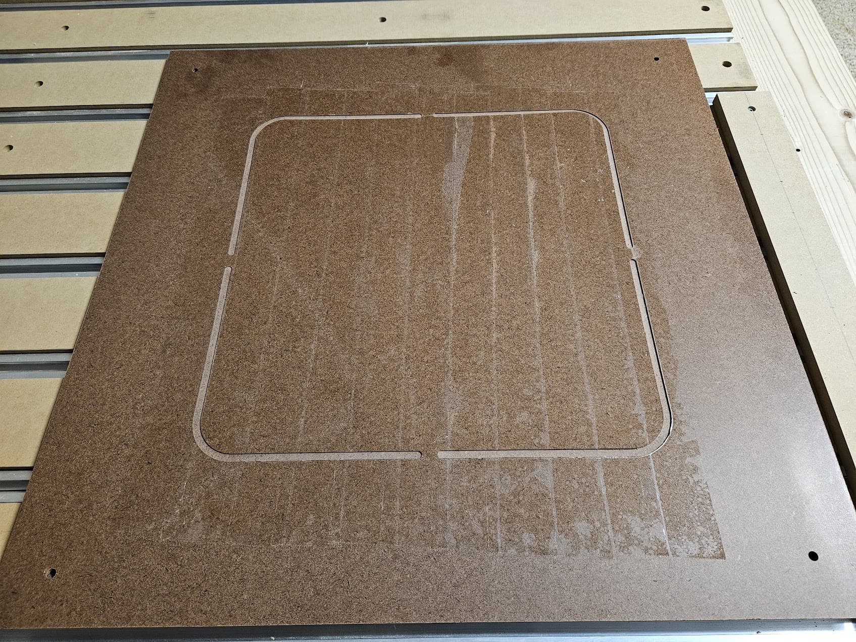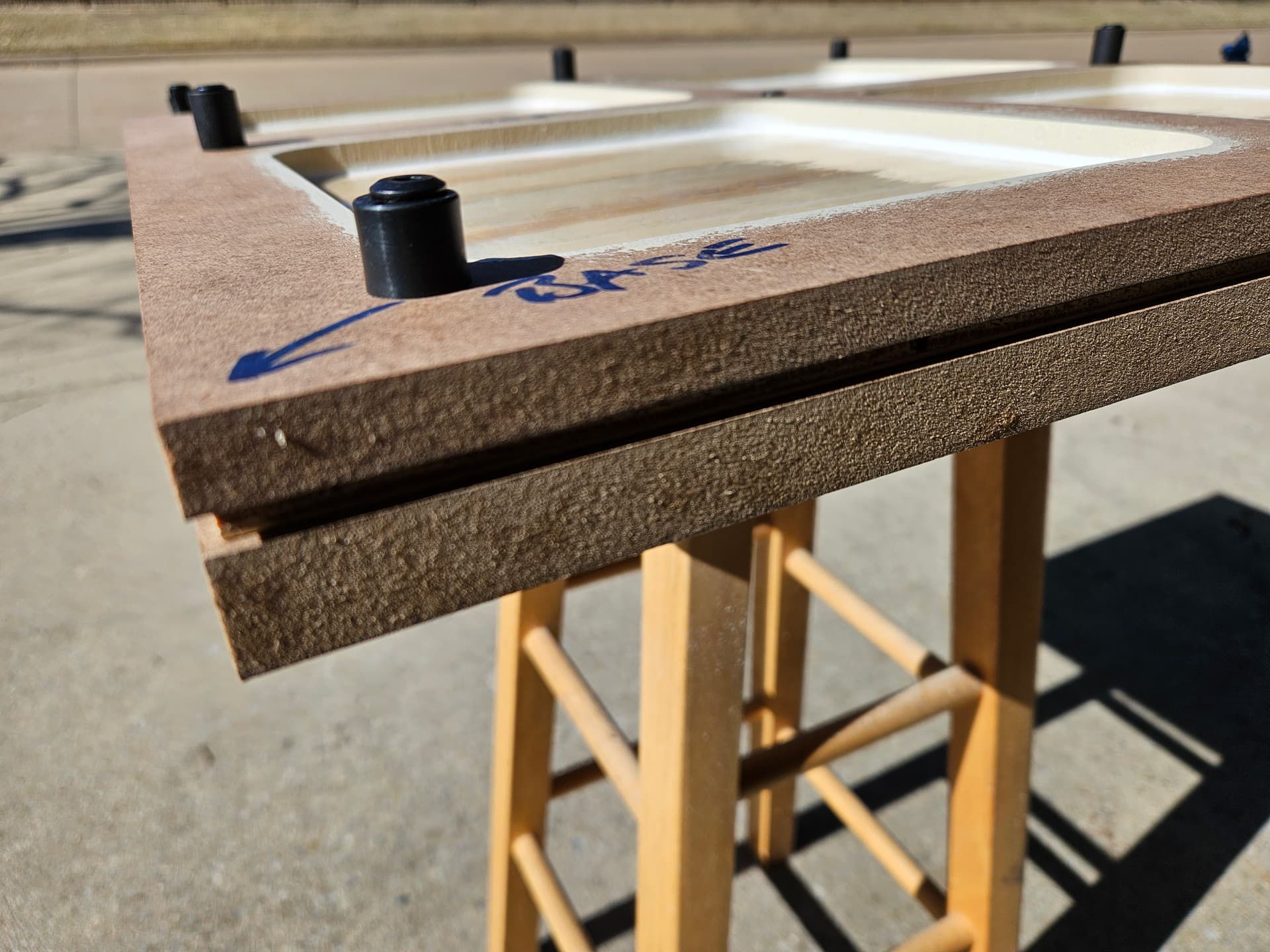 After the epoxy cures, I unbolt the three panels, and the top two are what goes on the Shapeoko to cut out the board. I use a different Carbide Create file for this as it accounts for the new thickness. I cut just into the fiberboard. This allows for easy separation of the epoxy game board and the packing tape.