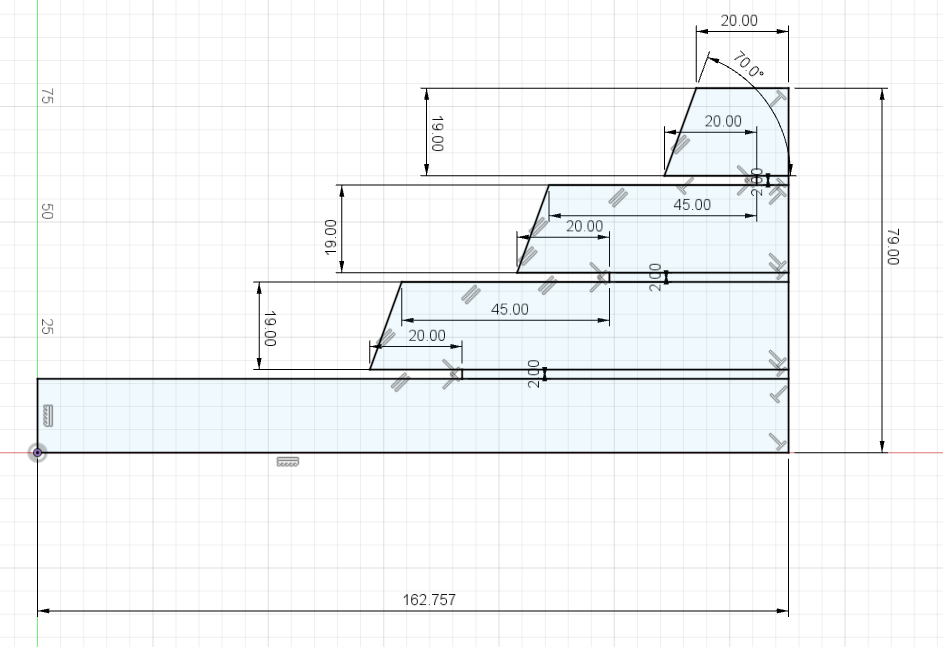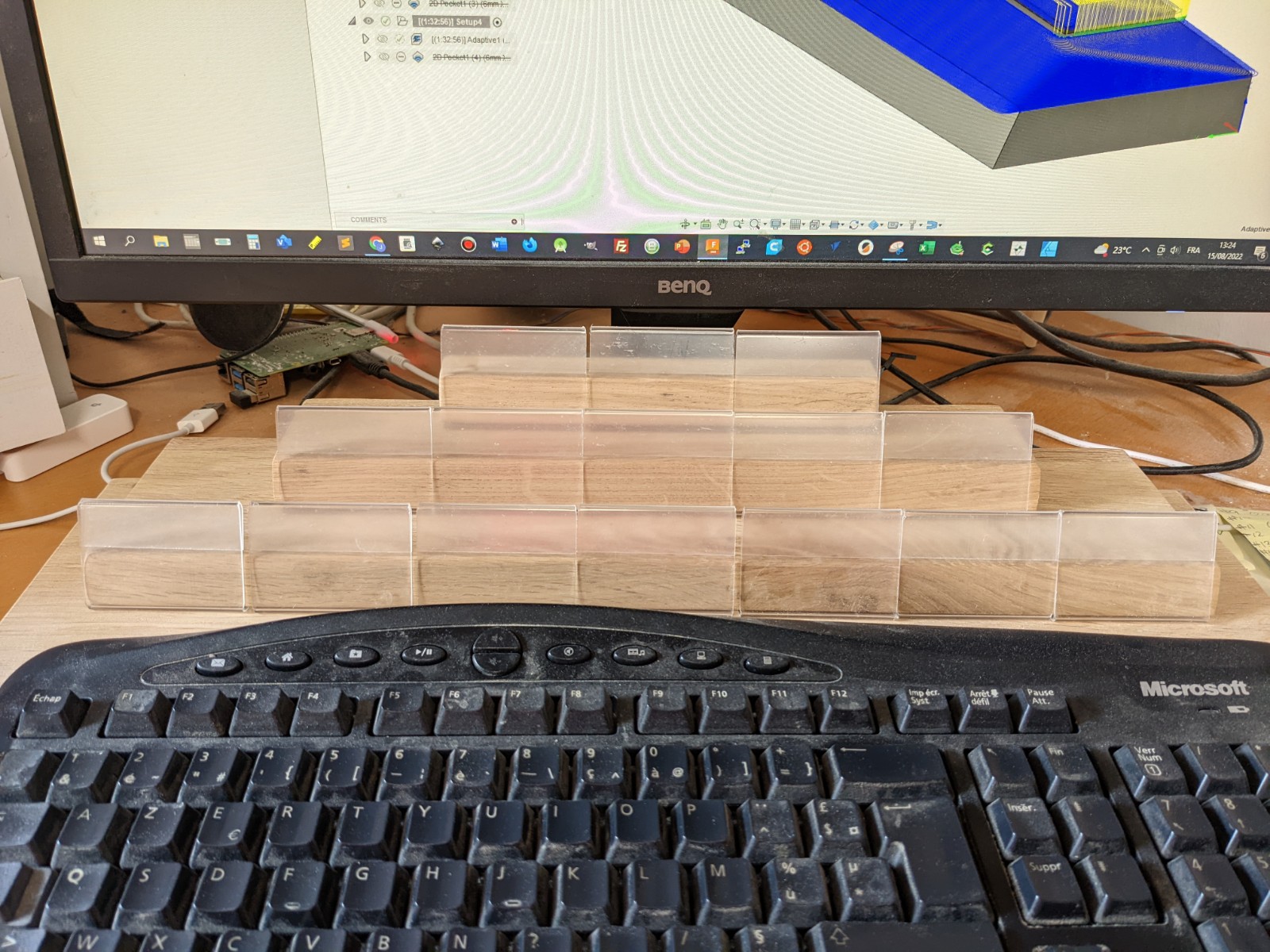 Anyways, to make the tall bulky pyramid I sliced the model into 4 levels, using regular woodworking tools to cut them to size and cut the 70° bevel, and finally used my Shapeoko to cut them to the final thickness and cut the embedded 2mm spacer between each layer and the next.