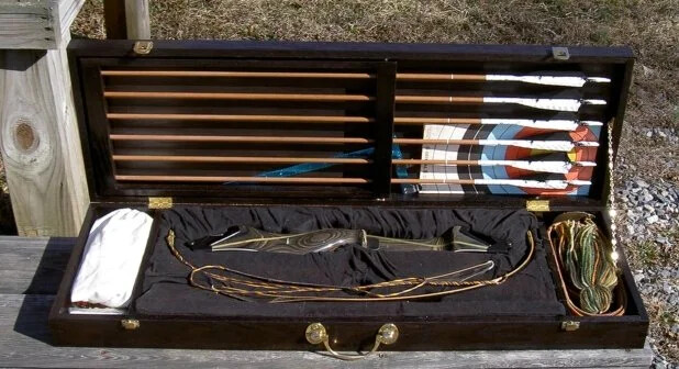 and if memory serves, can mix-and-match parts to get from ~30# at a 64" A.M.O. length to ~58# at 56" — while they came in nice leather cases, I really need to find the time to make at least one more wooden case.