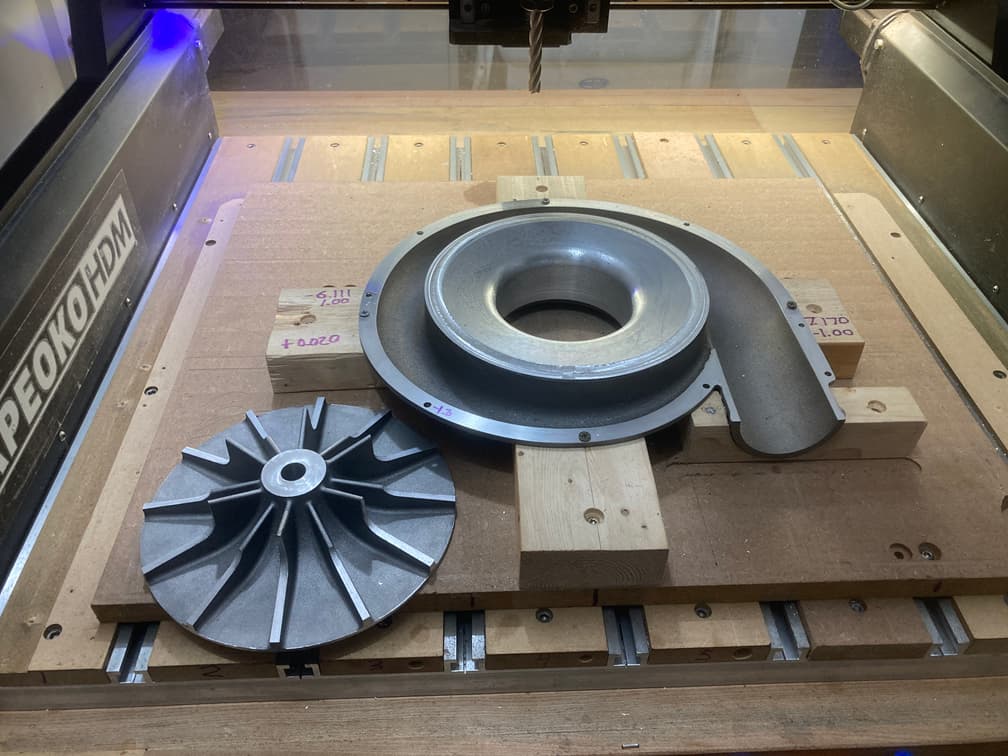 If you mean the blower, I also did several prototypes from billet on the HDM. The parts pictured are castings, and I cut the finished surfaces on the HDM. We adjust output volume & pressure by changing the fin height on the impeller, so with a taller fin I have to machine more off the bell in the cover to maintain a 0.005" gap.