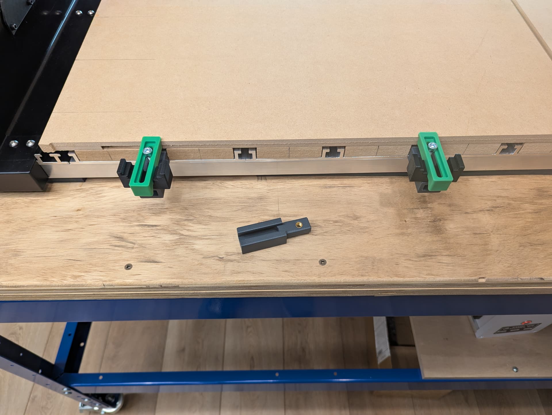 I’ve got a 4x2 S5P. I have an 4’ x 2’ MDF panel I need to make some cuts in. How do I hold the workpiece? There are T-slots available to the left and right side of the panel, but all of the hold-down clamps I have are either too long or too short to allow engagement with the workpiece. What to do? I could print some clamps of a usable length – is there an alternative I’m not considering (I’m still very much a newbie to CNC).