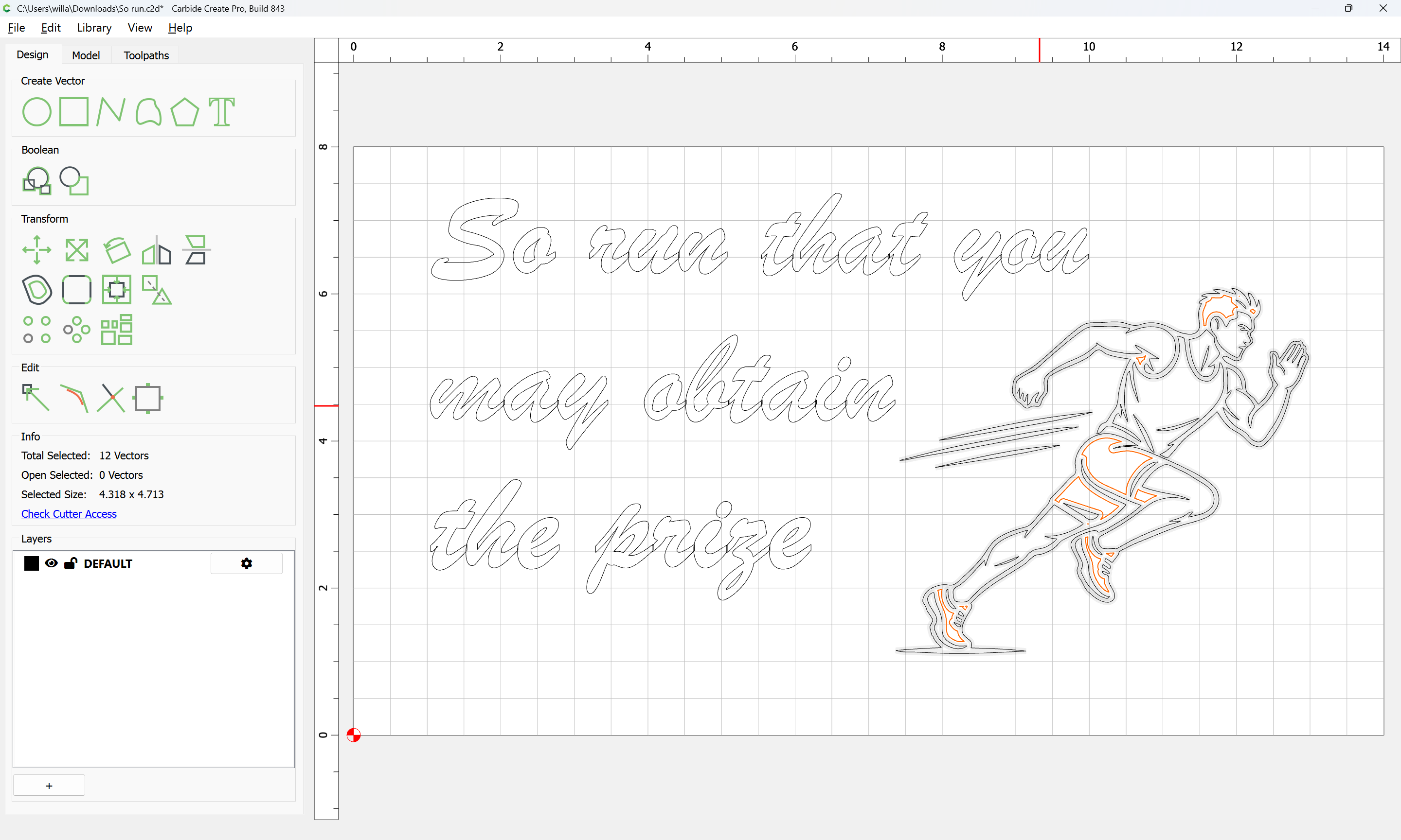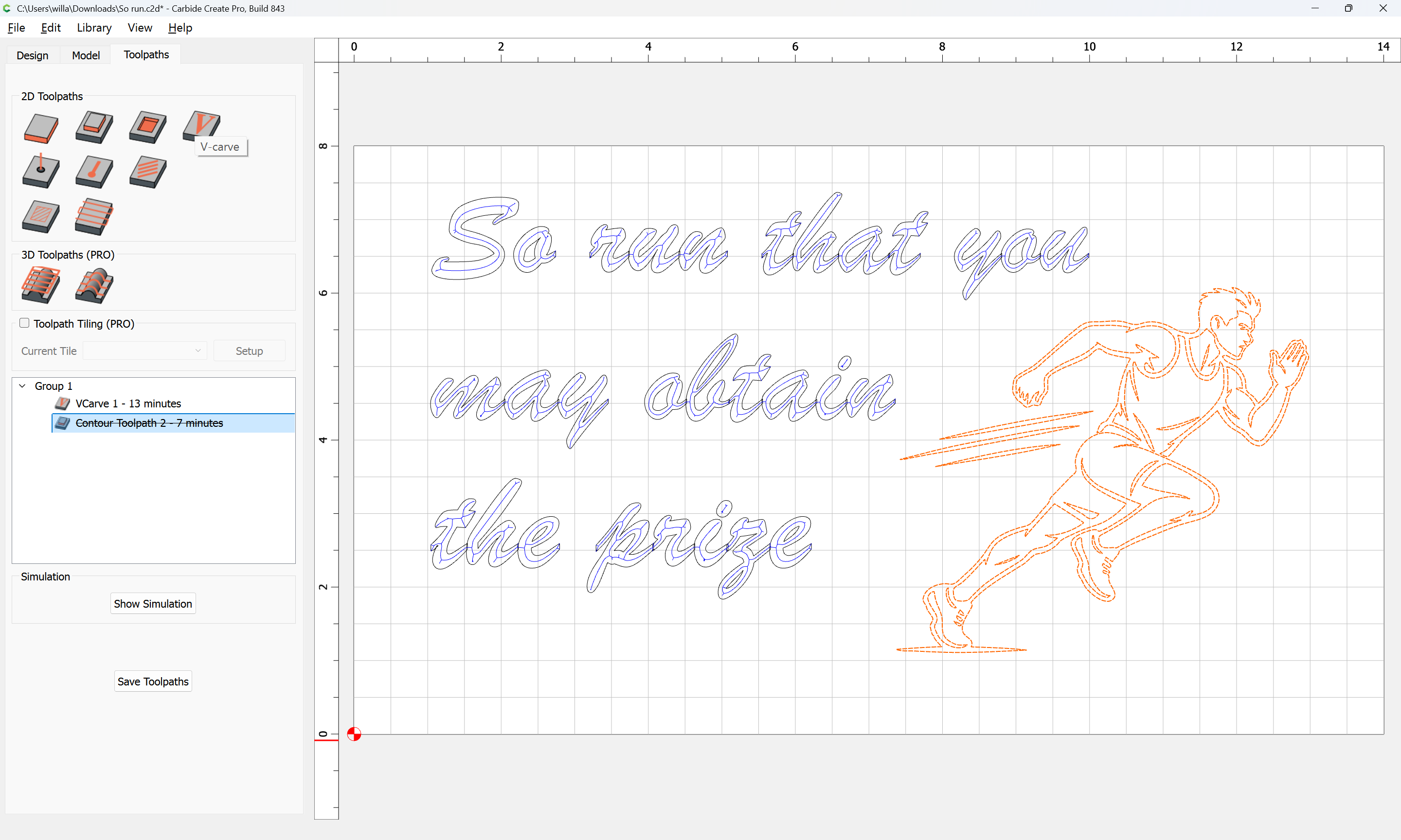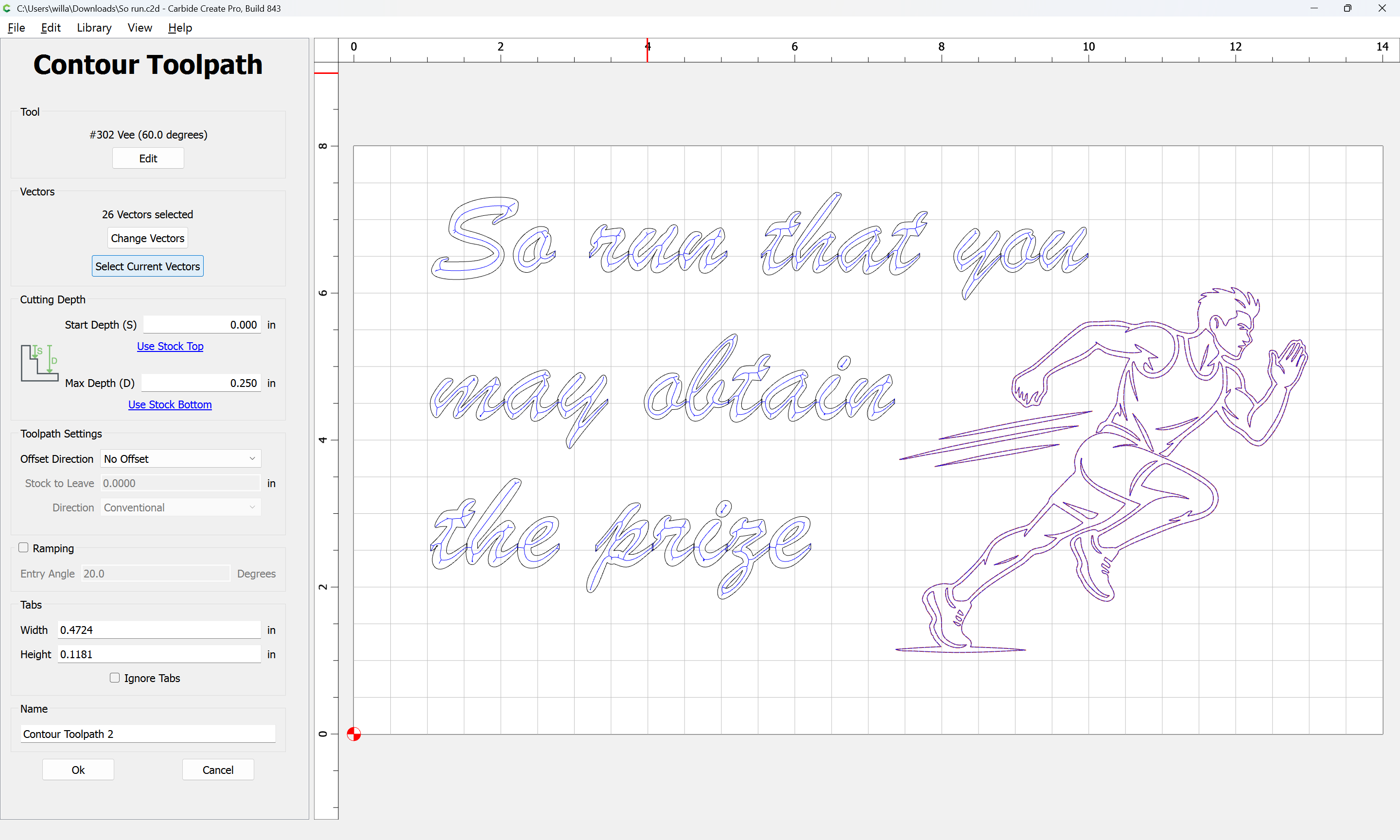 Here is my design. I had AI draw me a vector image for the athlete. How would you advise me to engrave that? Does it need cleaning up? Can I just contour with a Vee bit?