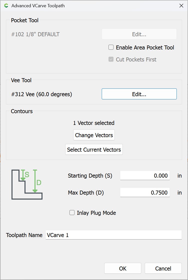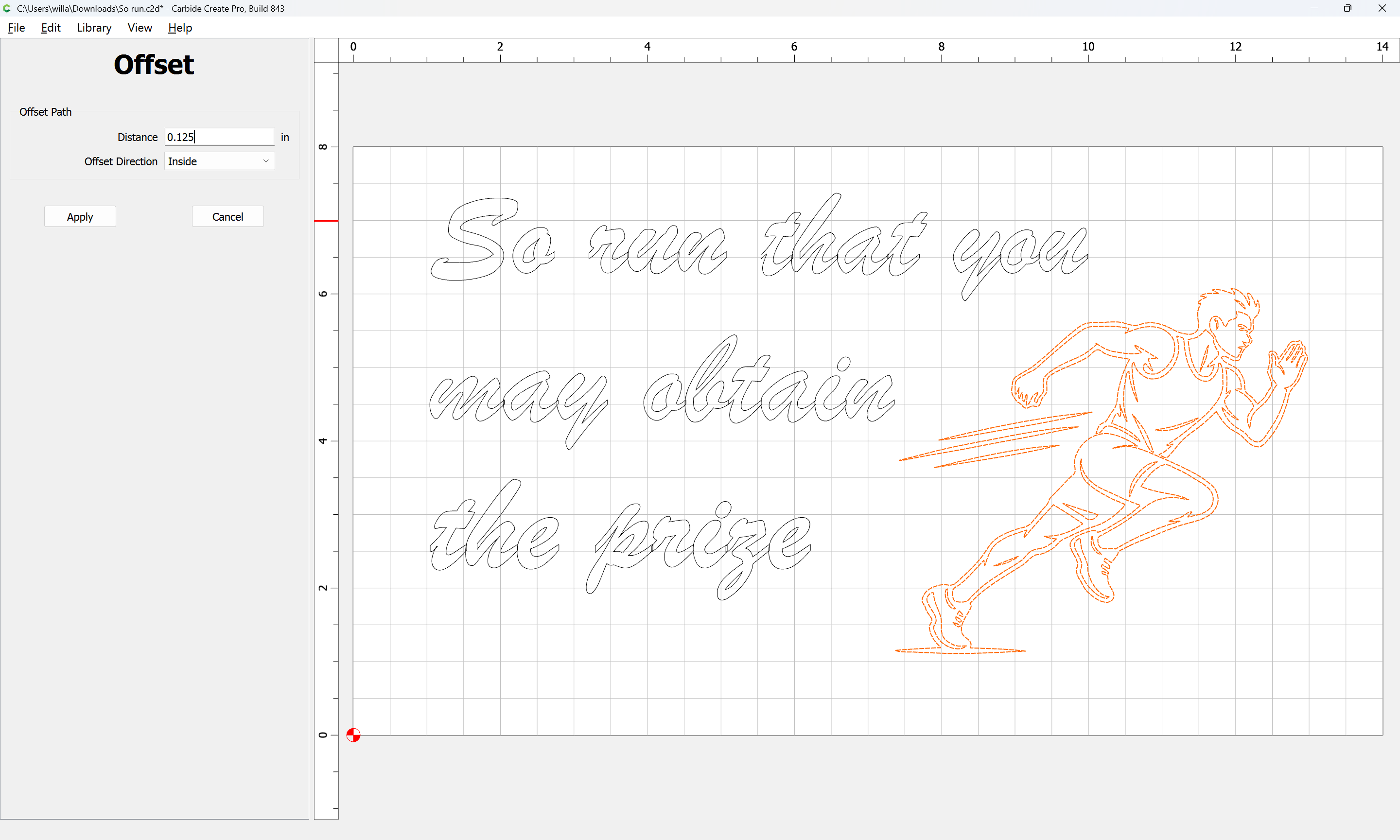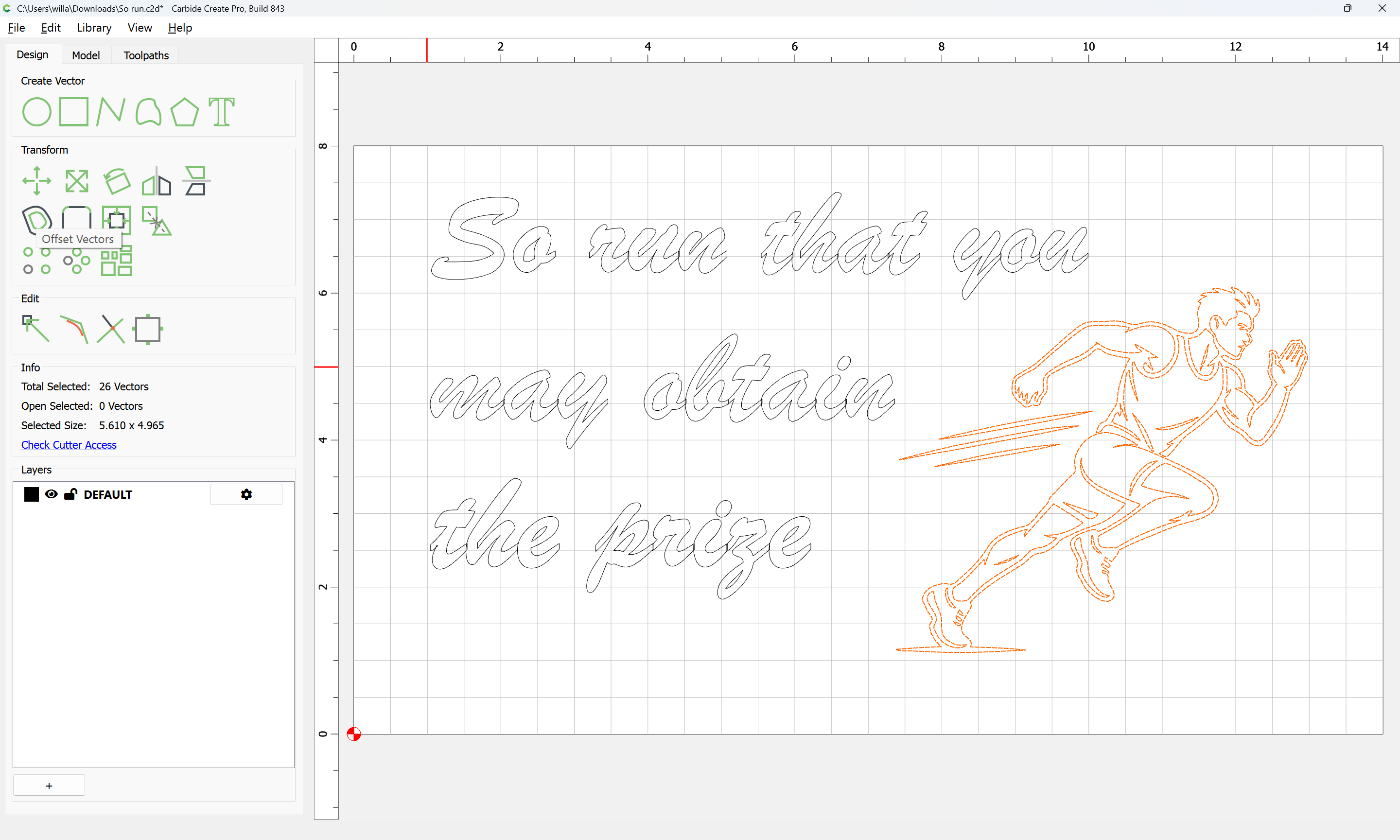 Then I grouped the Original Vector with the New Offset Vector and updated the Toolpath to include the new Vectors. I didn’t have your Font in my library so I had to redo the text. I included just the New Running Man SVG so you can input that into your original File. Also for the toolpath I used .125" for the DOC.