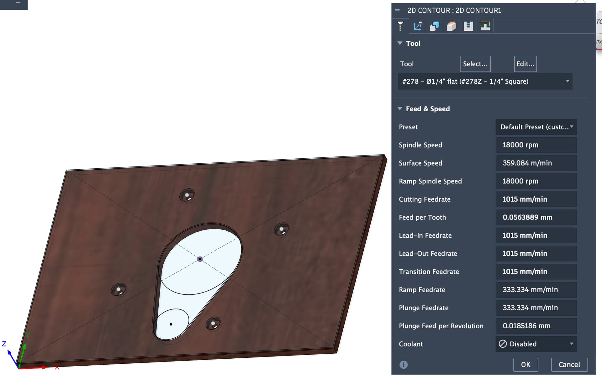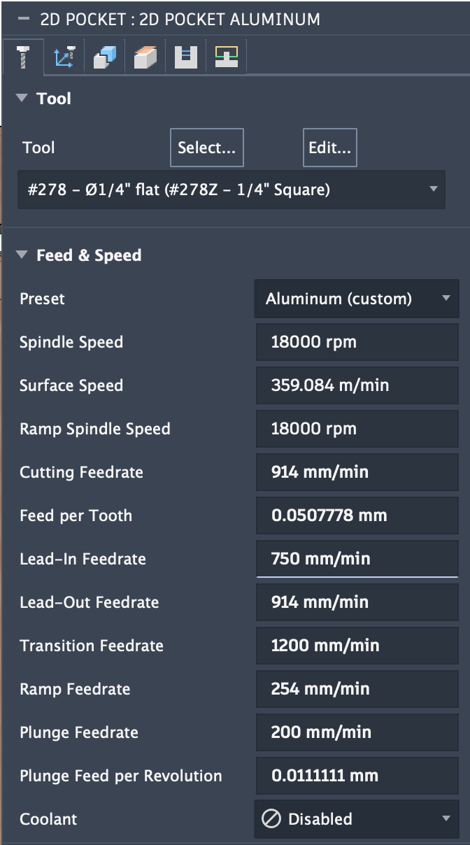 Does that look about right? I took the speeds and feeds from @wmoy’s old video on cutting aluminum on the Pro (which is what I have), using the 278-Z cutter. I’ll bore the holes with the 274-Z.