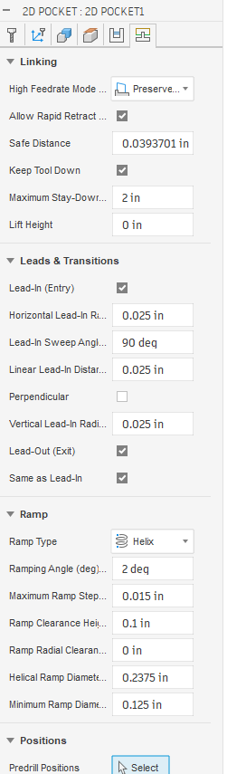 EDIT: The Ramp Clearance height of 0.1 is too much. I watched it run wondering what the h.ll is it doing. I will change it 0.025 ( another SWAG ) to take some time out of it, the material is faced, no bumps to worry about.